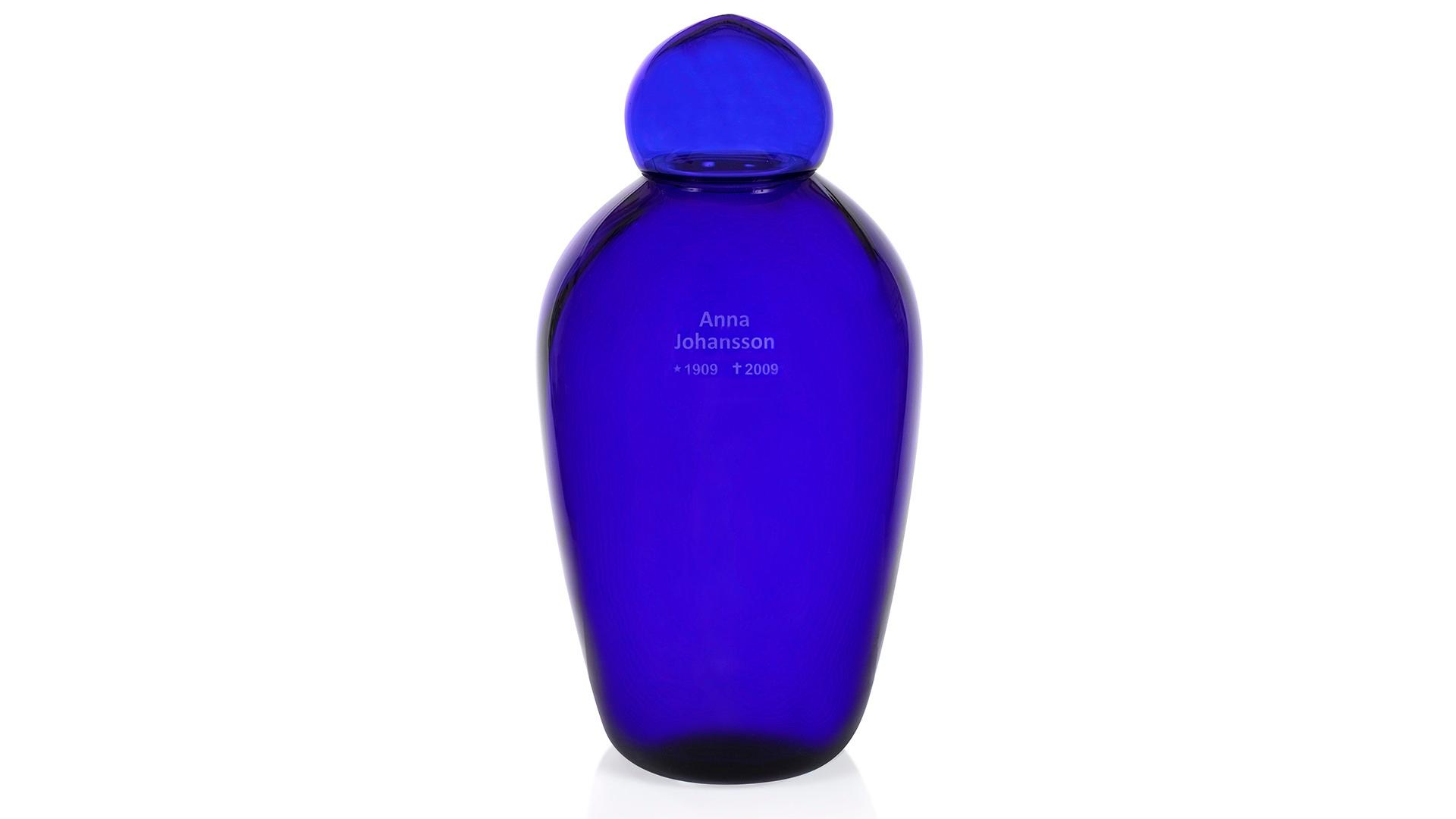 Blå munblåst glasurna från Målerås glasbruk i Småland. Önskad gravyr blästras direkt på glaset.