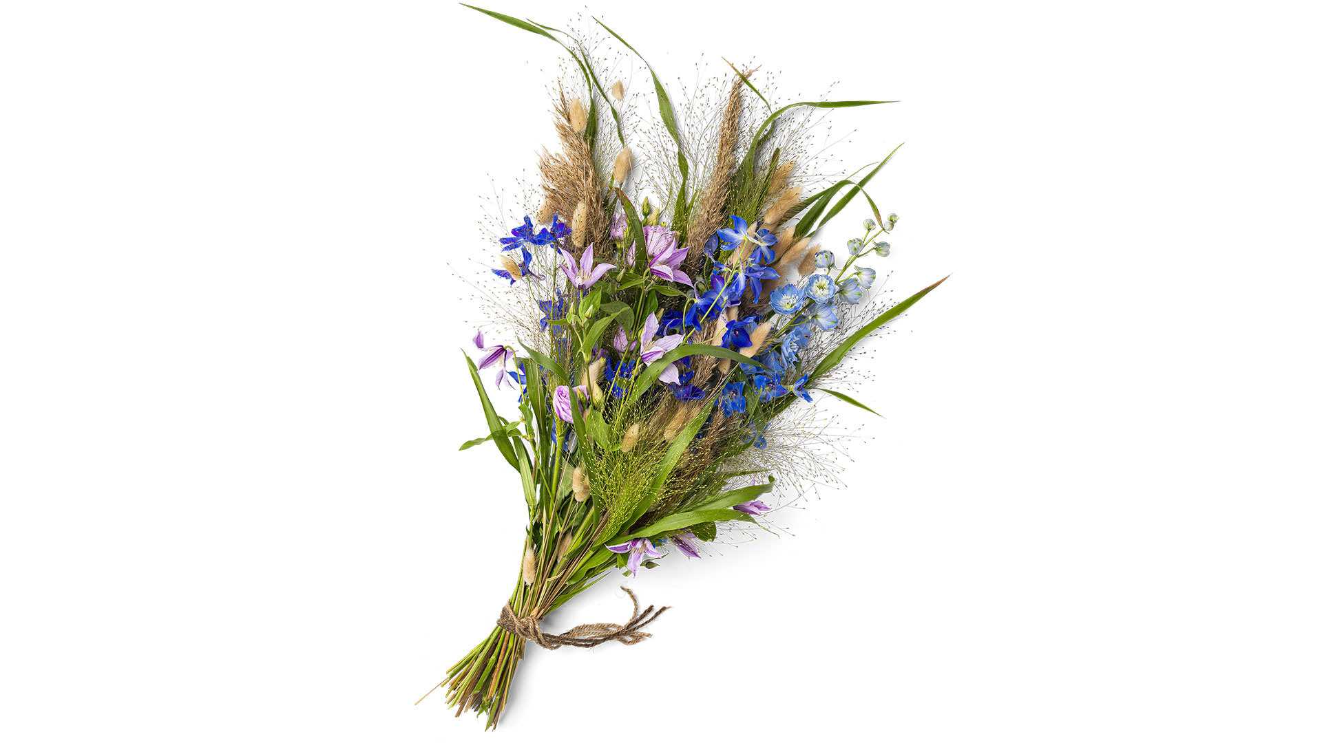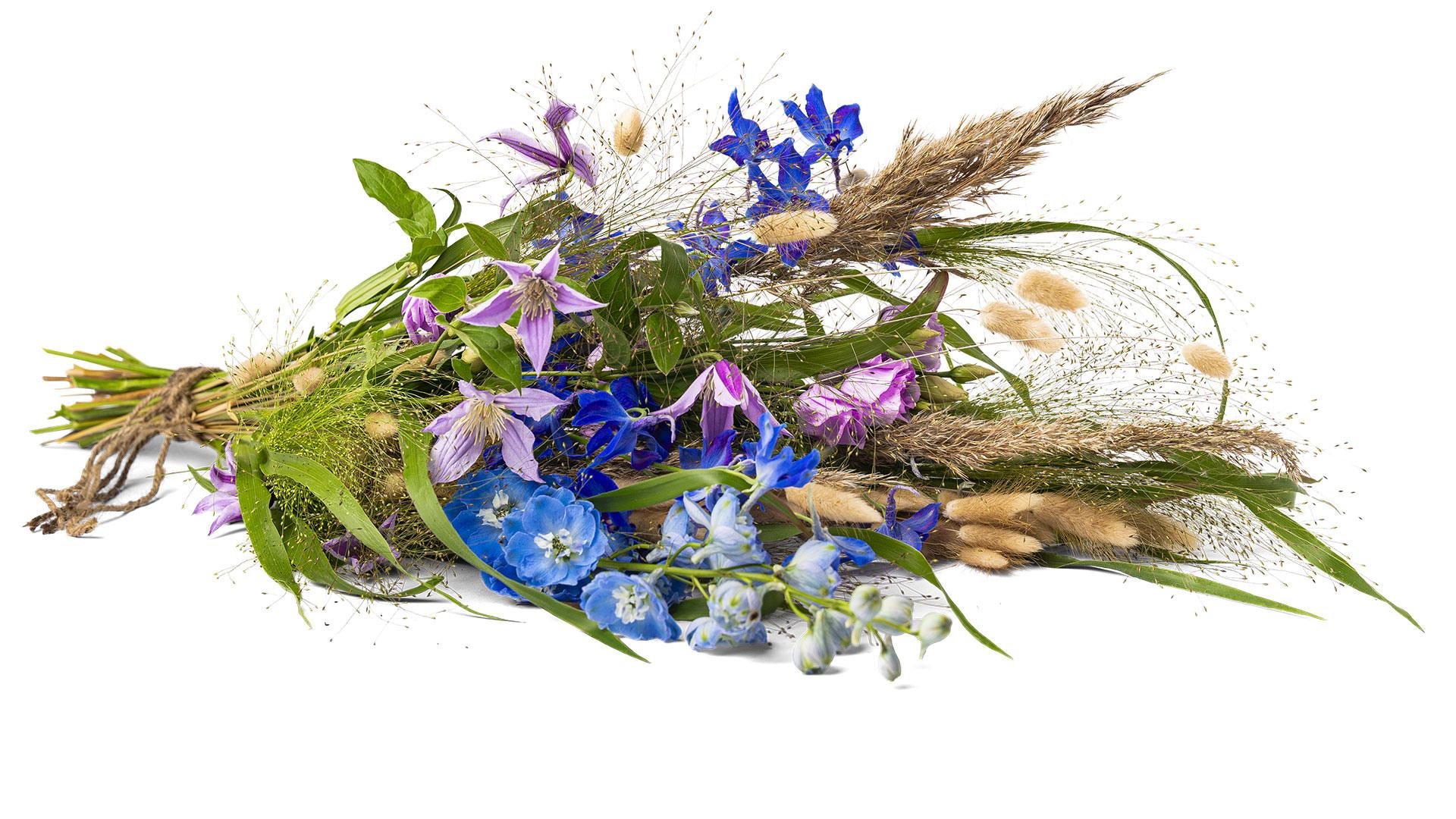 En liggande bukett i blålila och grönt inspirerad av hav och strand.