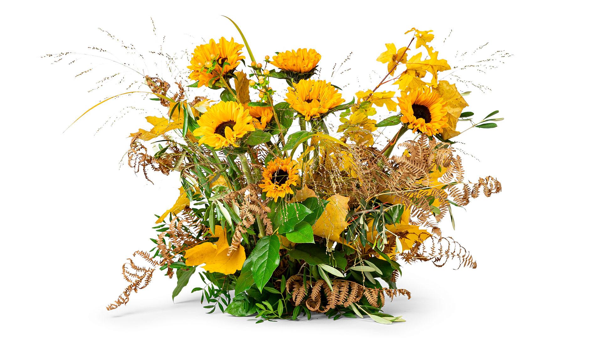 En mindre blomsterdekoration i gyllene färger med gula solrosor och vackra torkade blad.