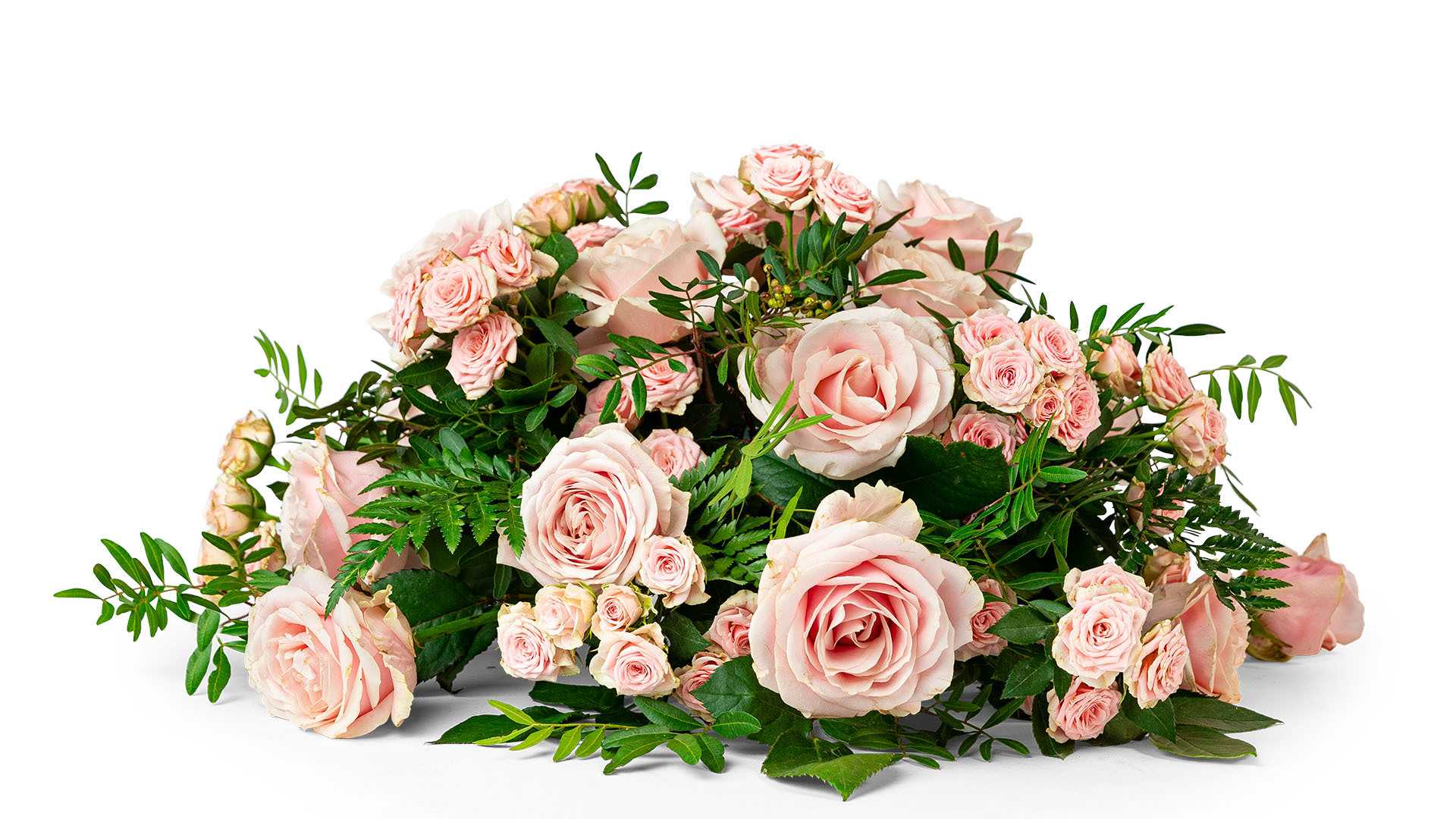En mindre blomsterdekoration i form av en kudde med vackra rosa rosor och gröna blad.