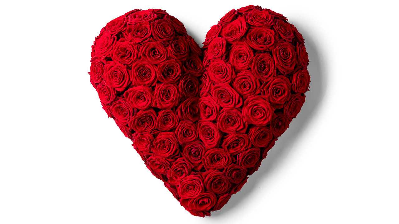 Ett fyllt kärlekshjärta med vackra djupröda rosor.
