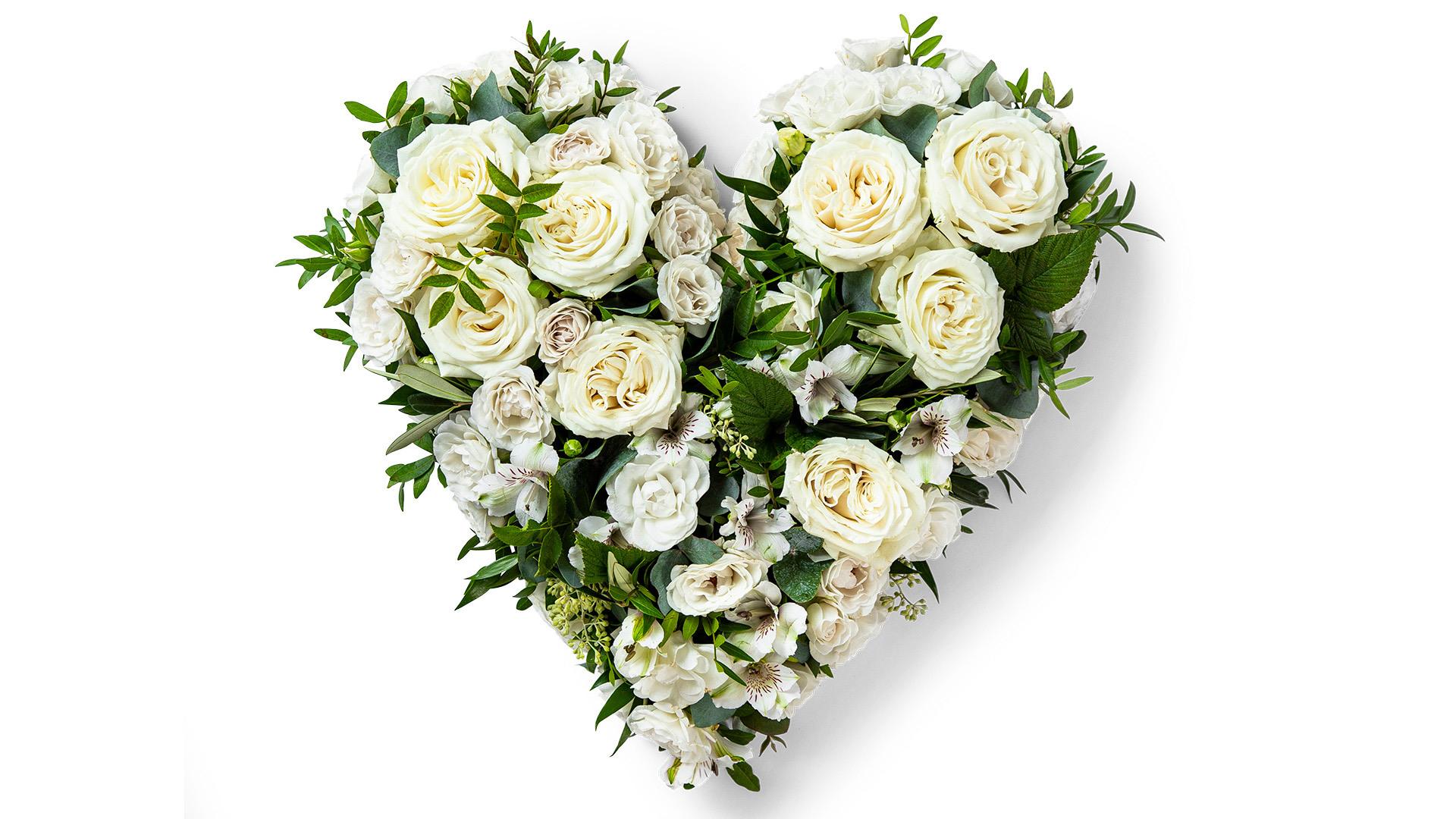 Ett fyllt hjärta med cremevita rosor i olika storlekar och andra vita blommor tillsammans med vackert grönt.