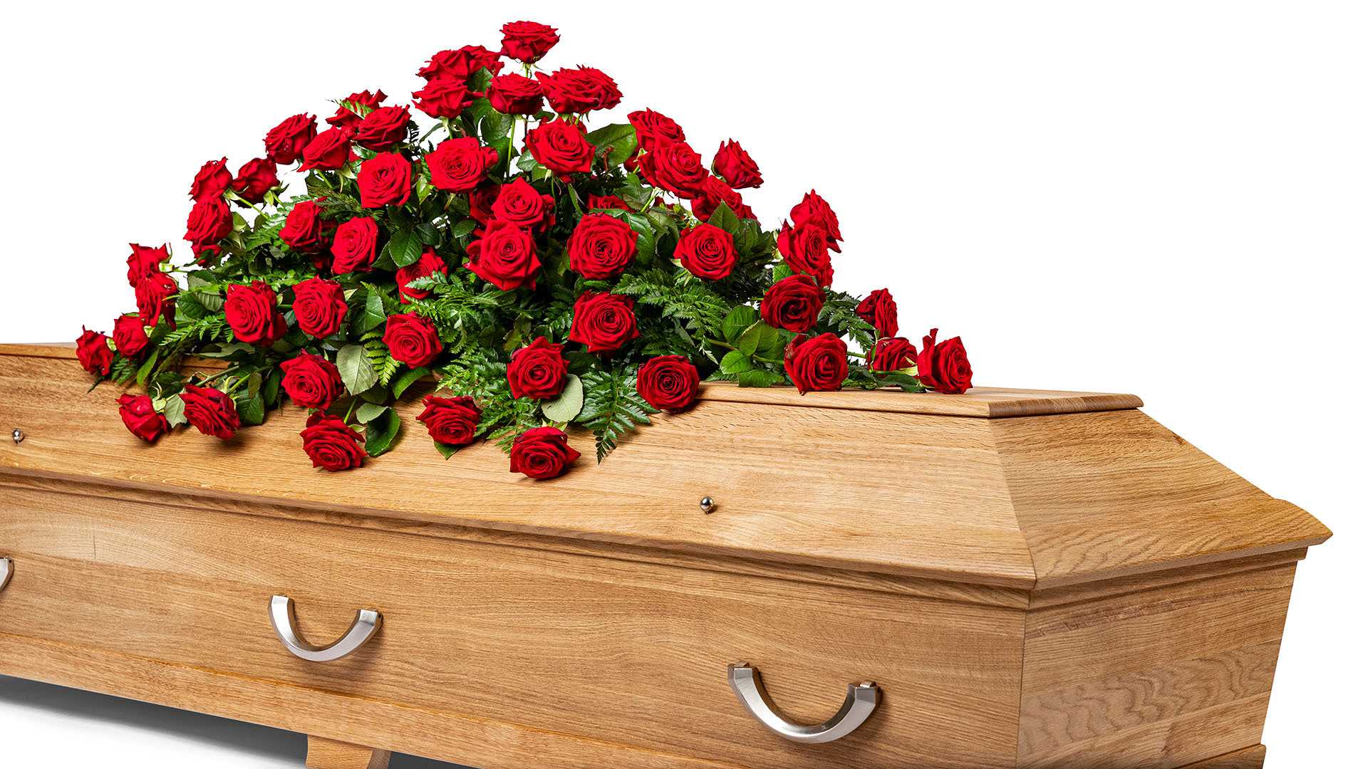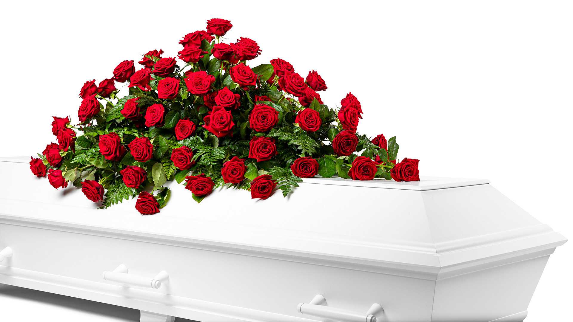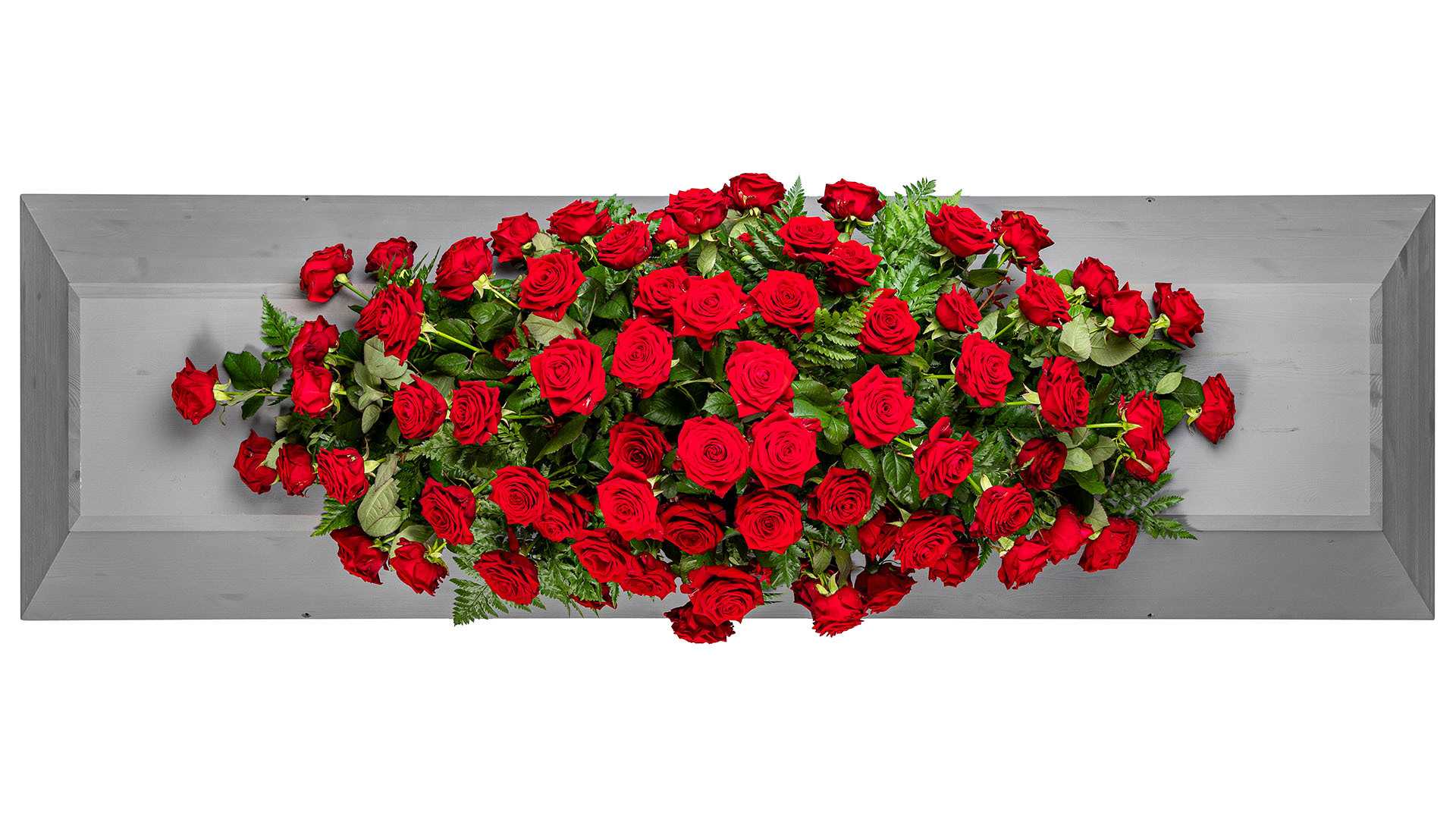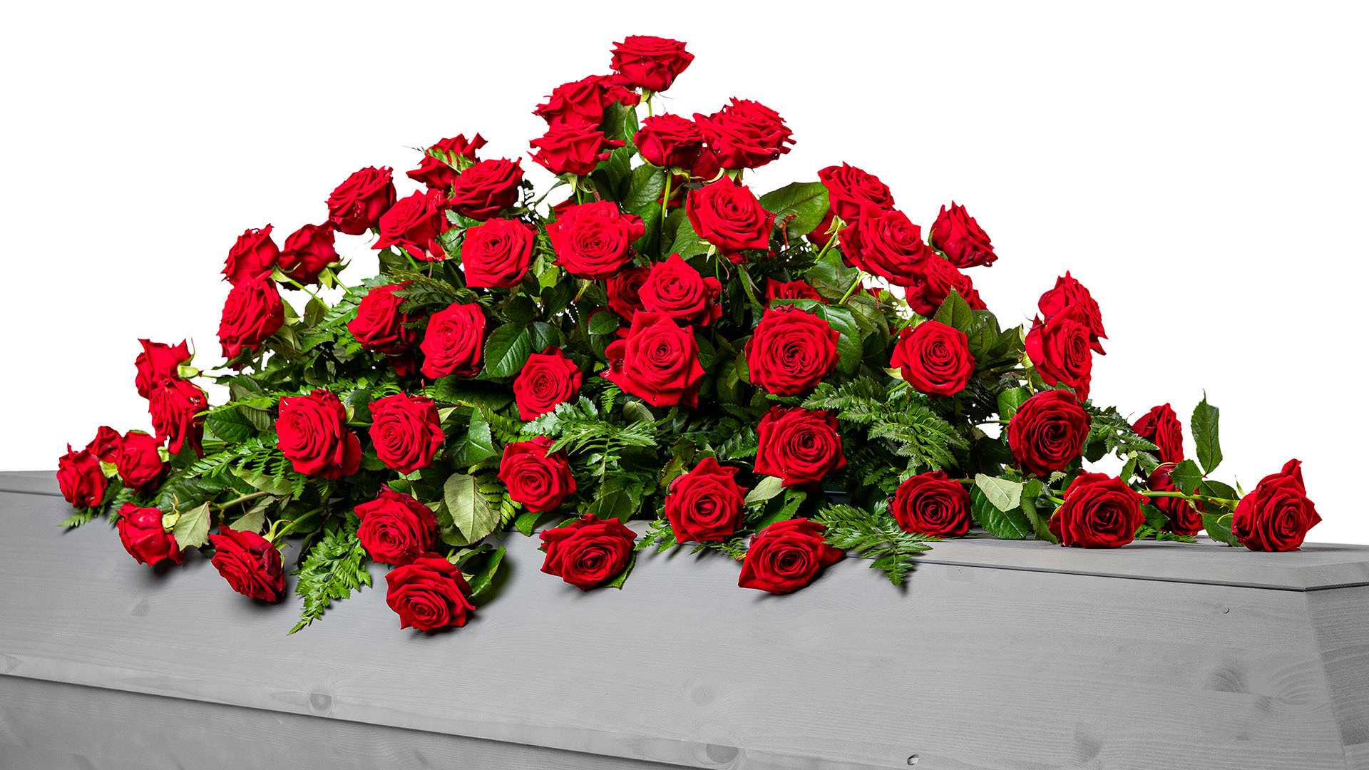 En klassisk stor kistdekoration med vackra djupröda rosor och gröna inslag.