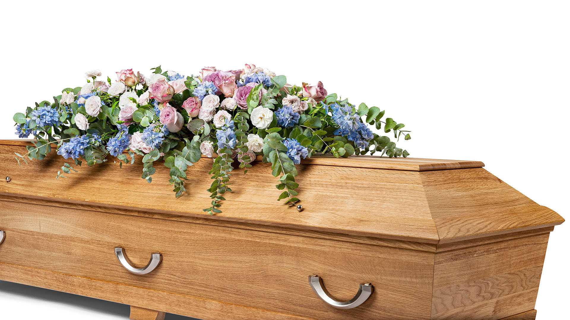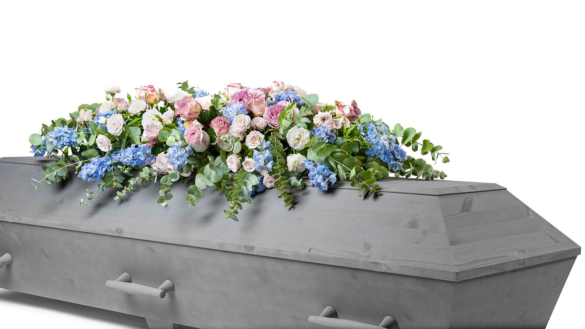 En flödande låg kistdekoration med rosor i rosa och lila toner, blålila riddarsporrar och silvergrå eukalyptus.