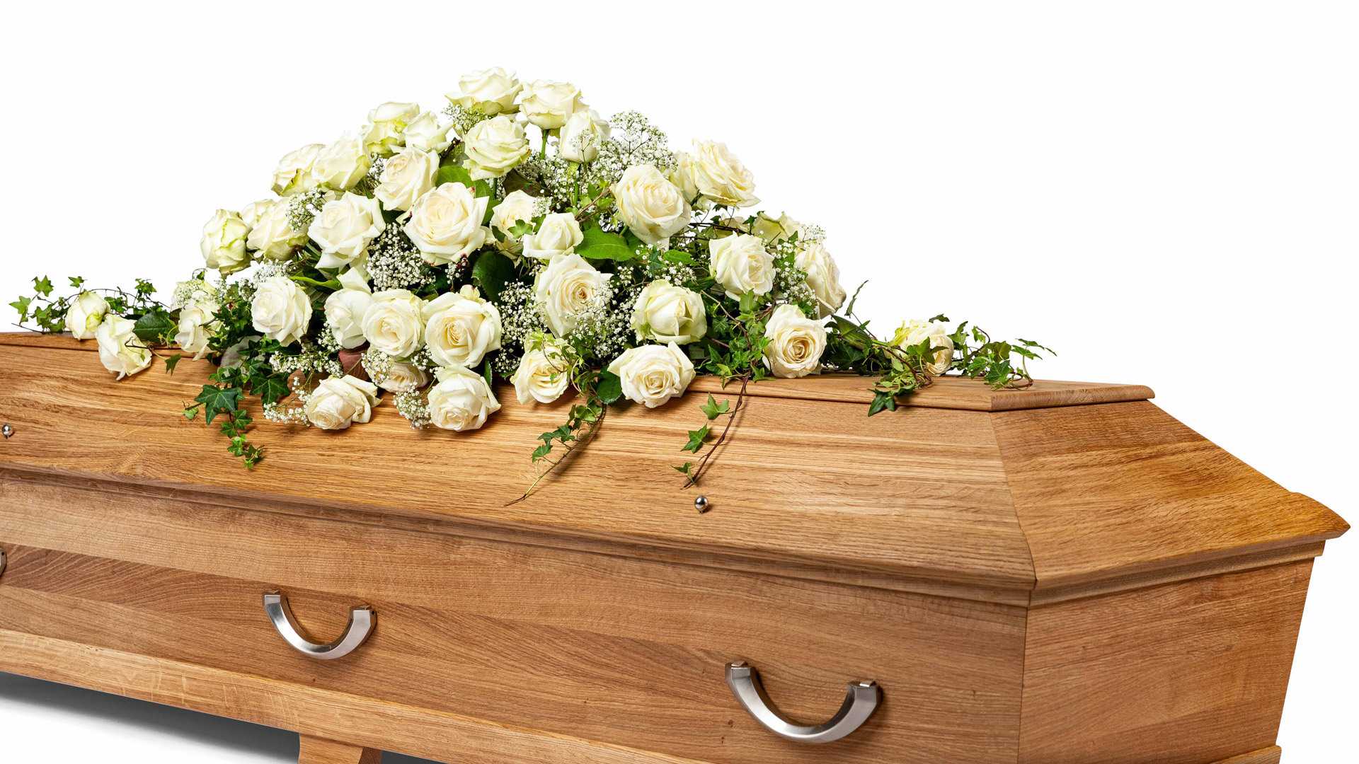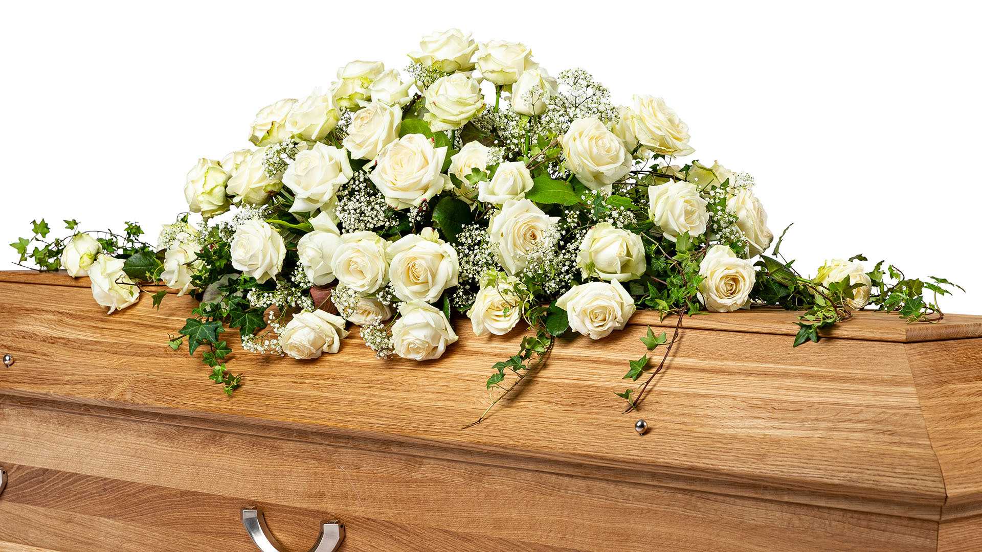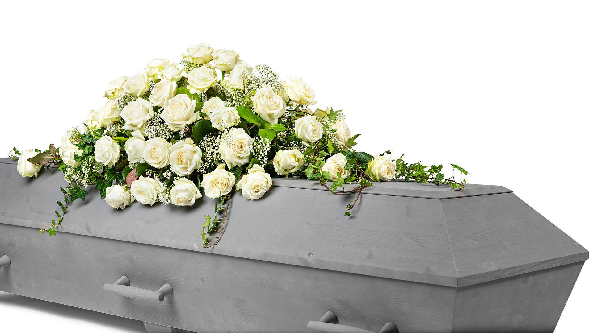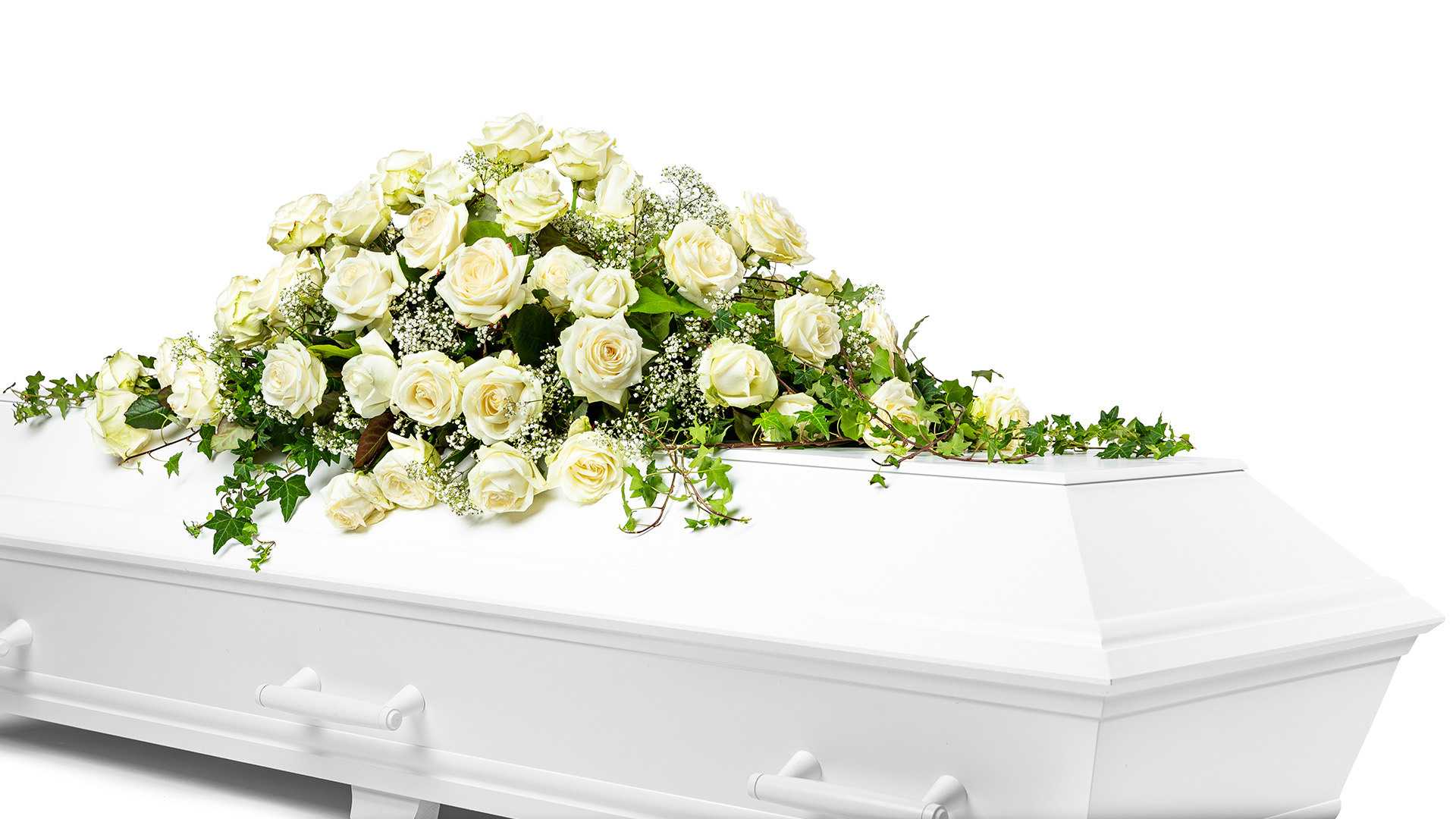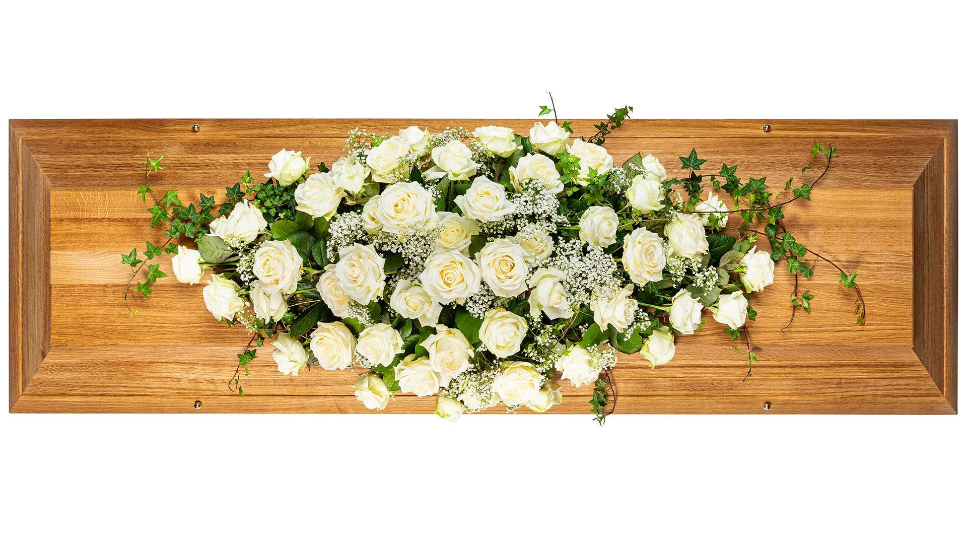 En klassisk stor kistdekoration med cremevita rosor, kvistar av skir brudslöja och slingrande grönt.