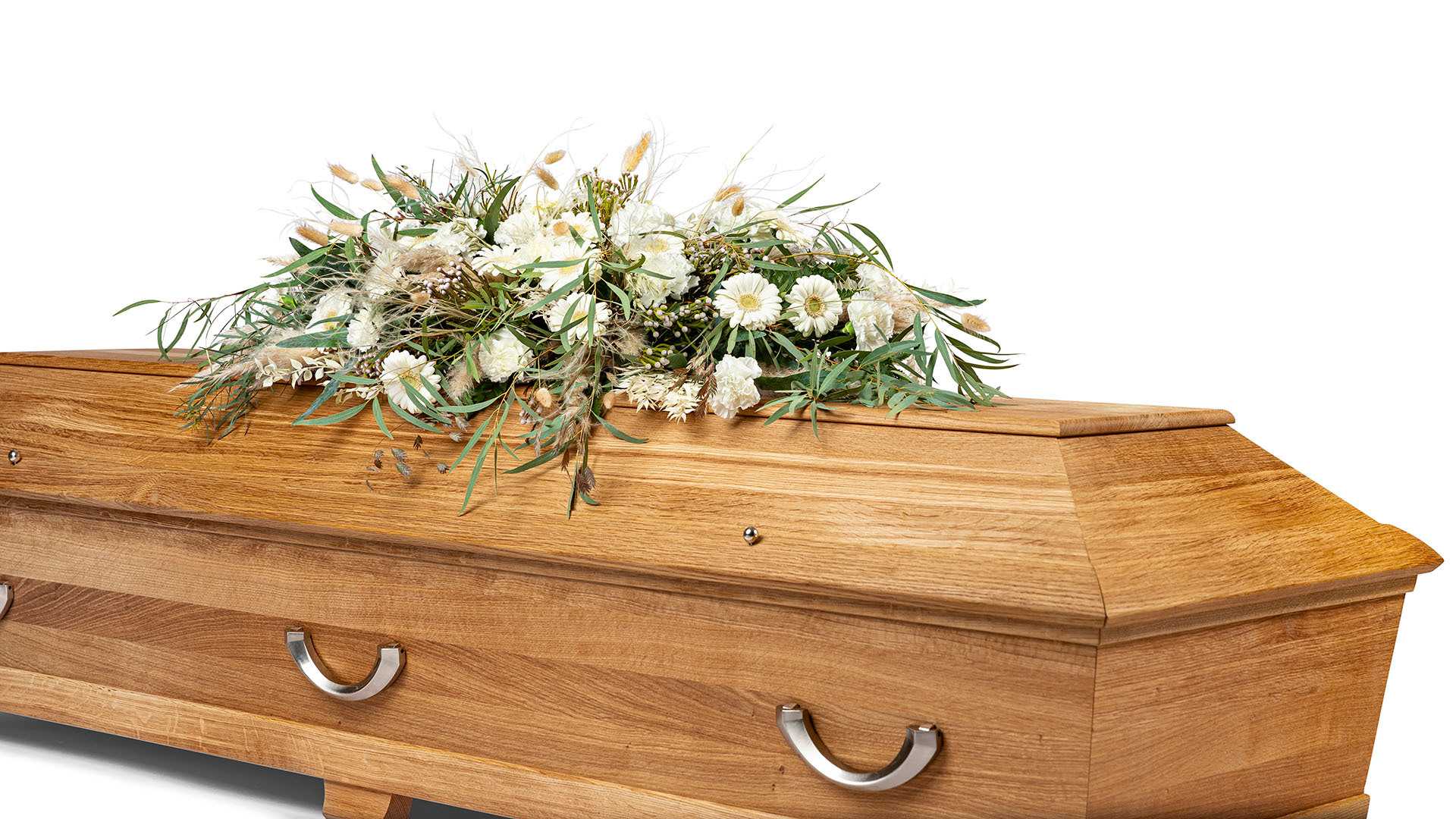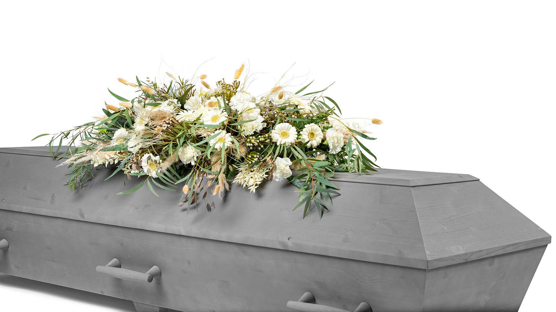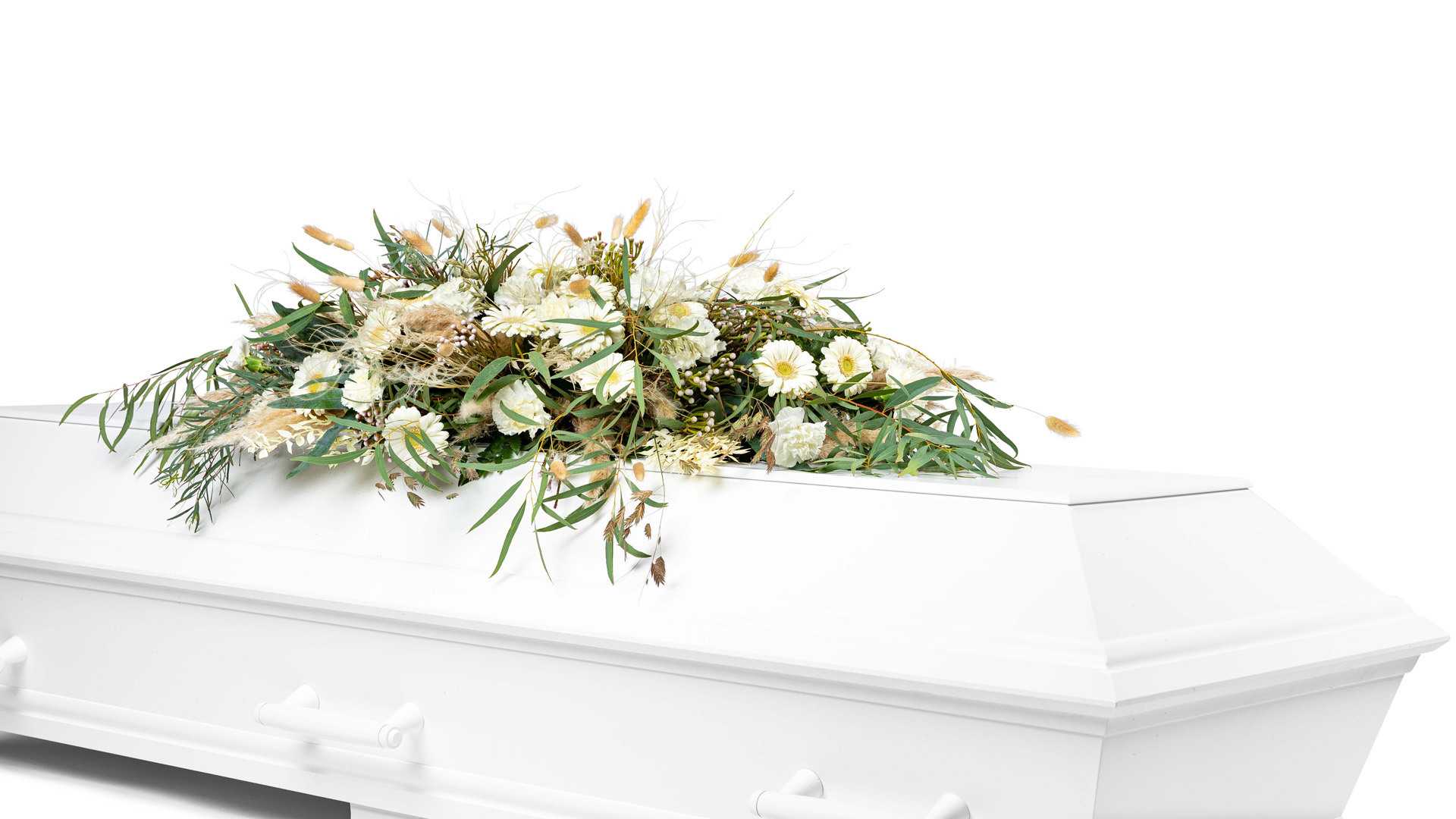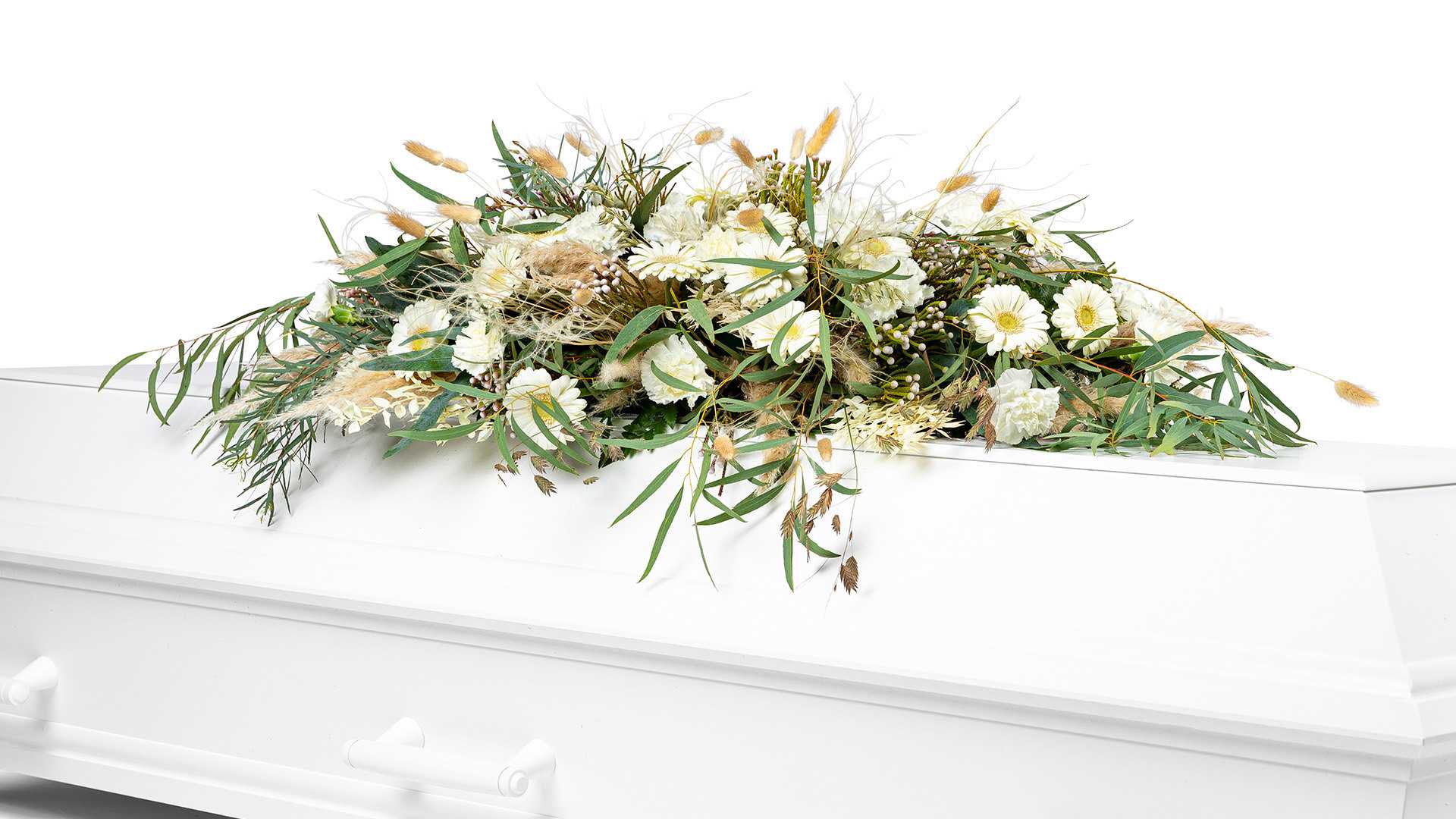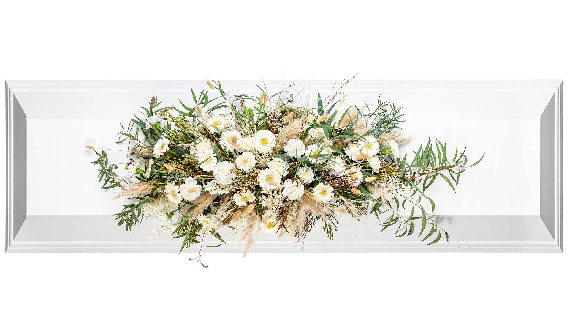 En naturskön mindre kistdekoration med olika vita blommor, kombinerat med torkade kvistar och gräs.