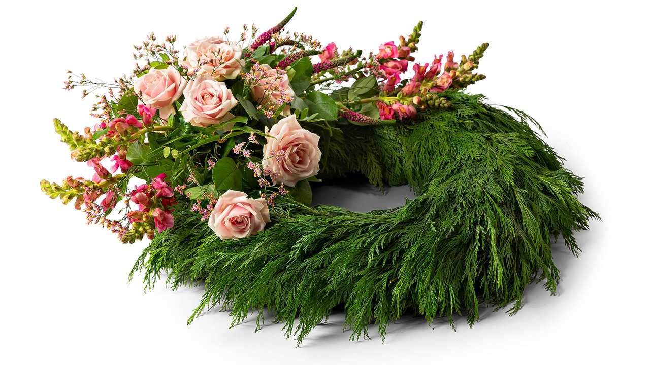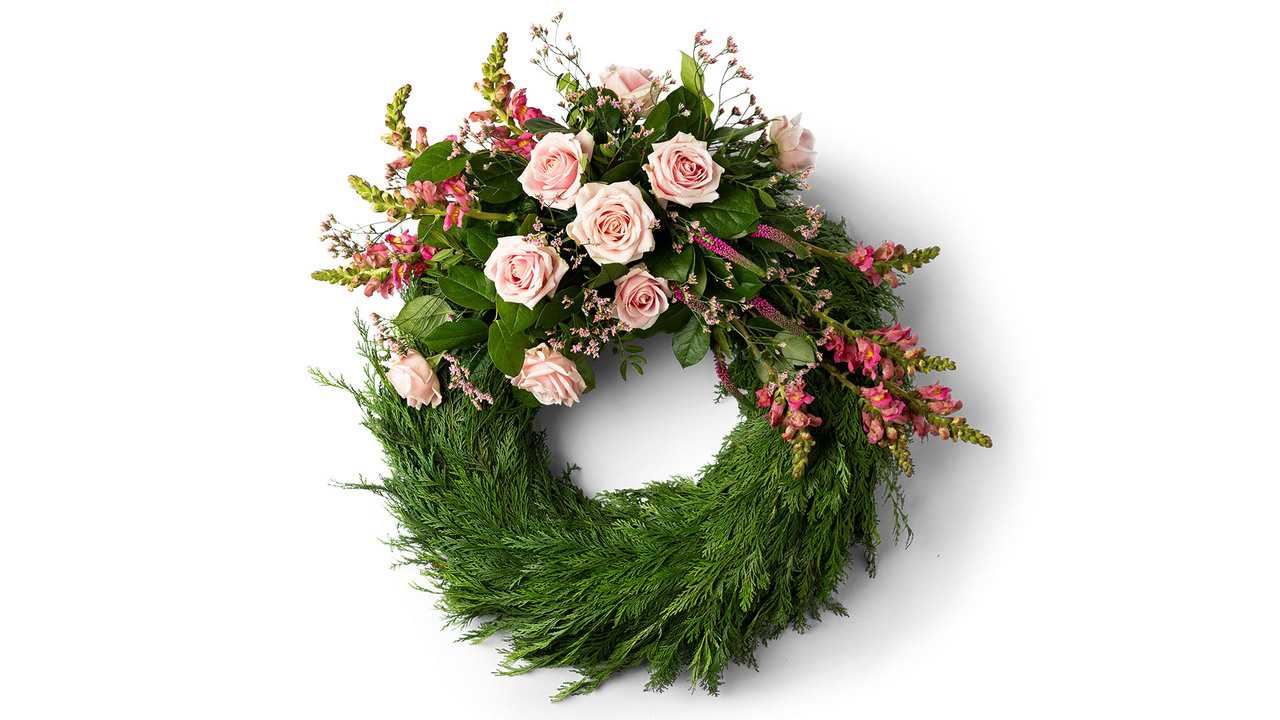En klassisk krans med rosa rosor och blandade blommor i samma färgskala.