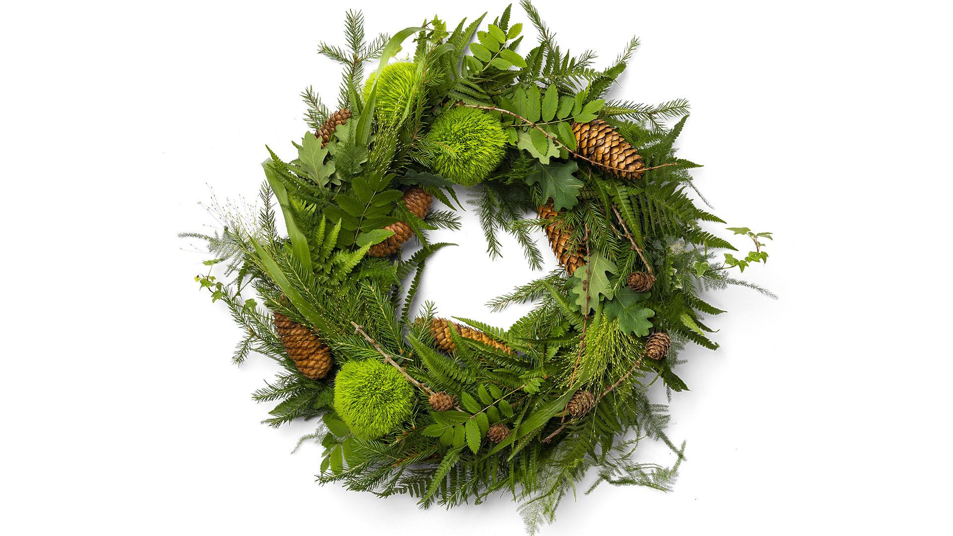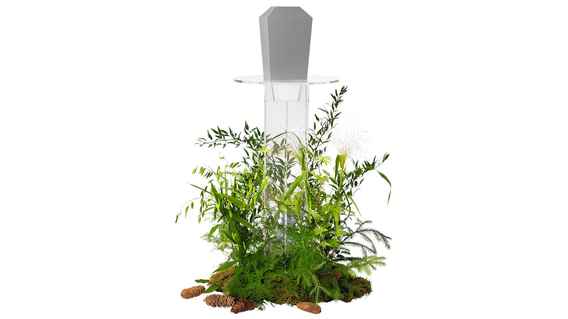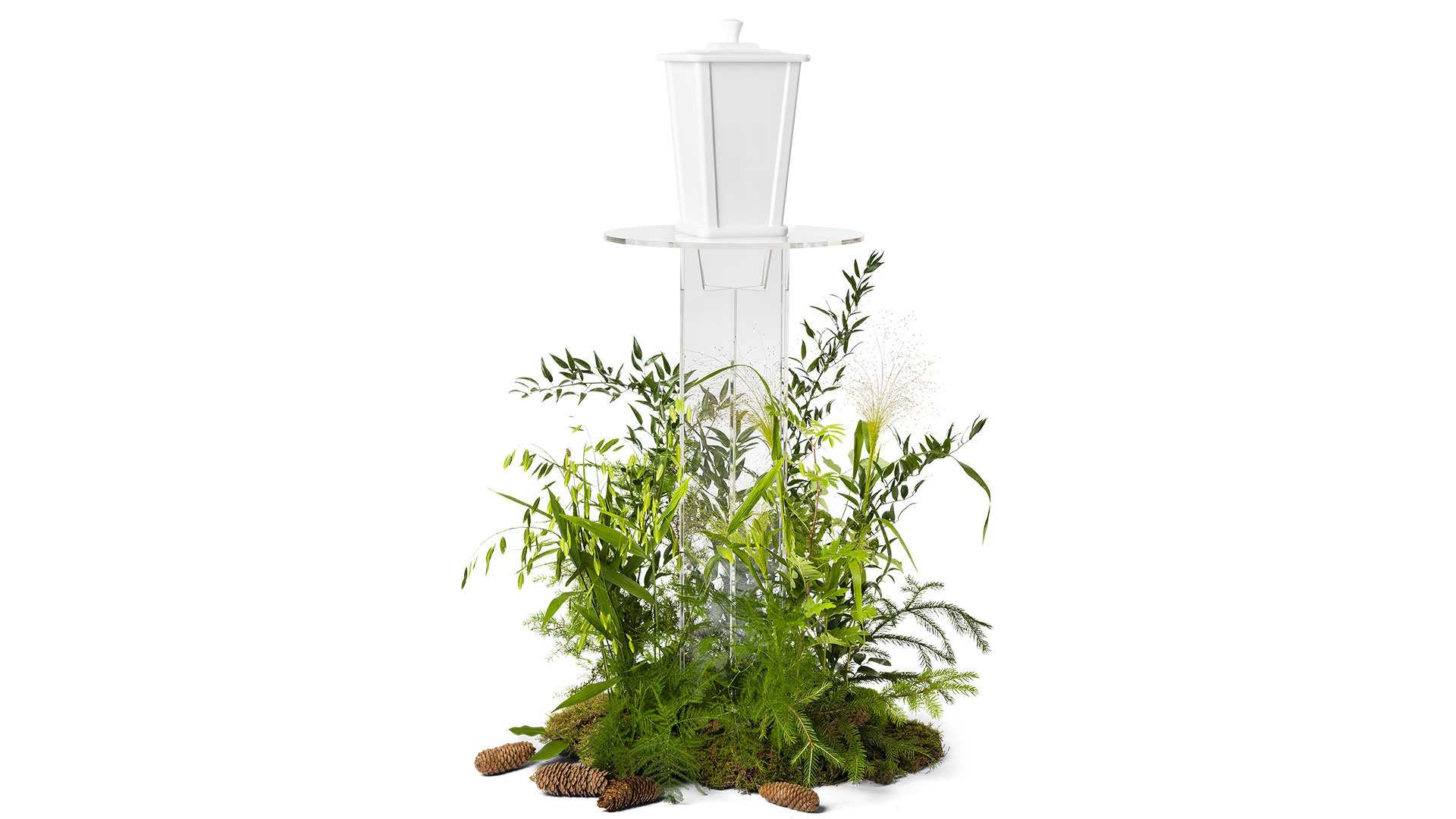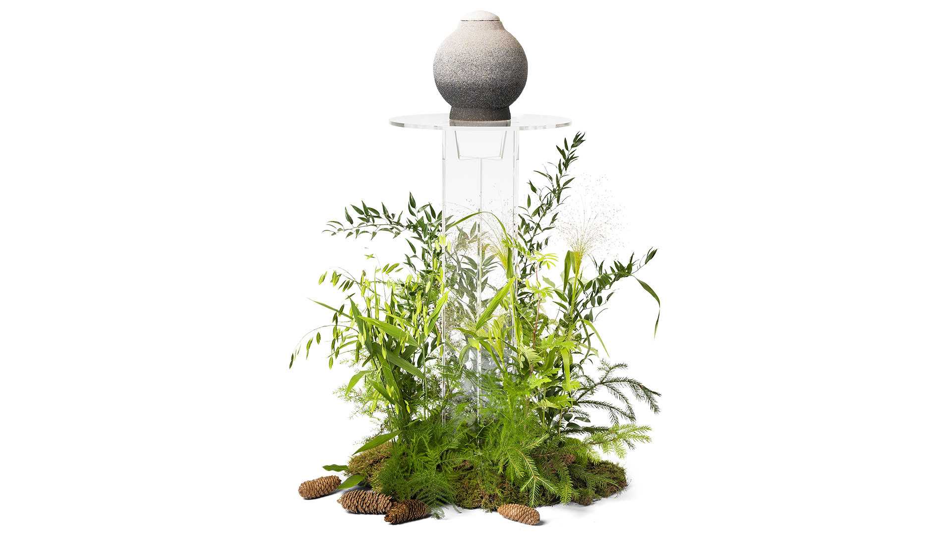 En grönskande urndekoration med inslag och detaljer från skogen.