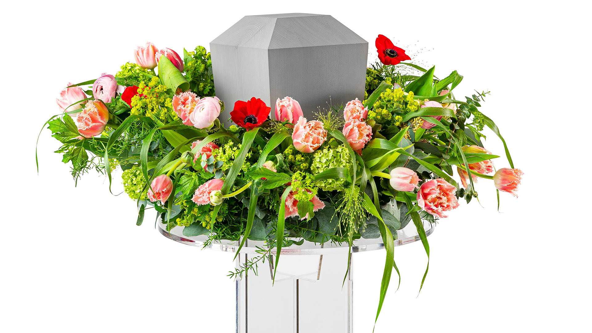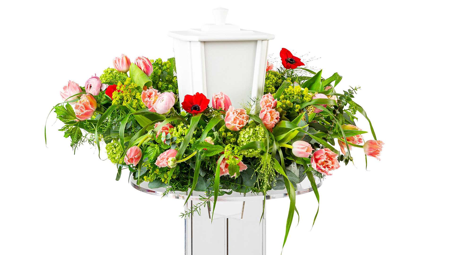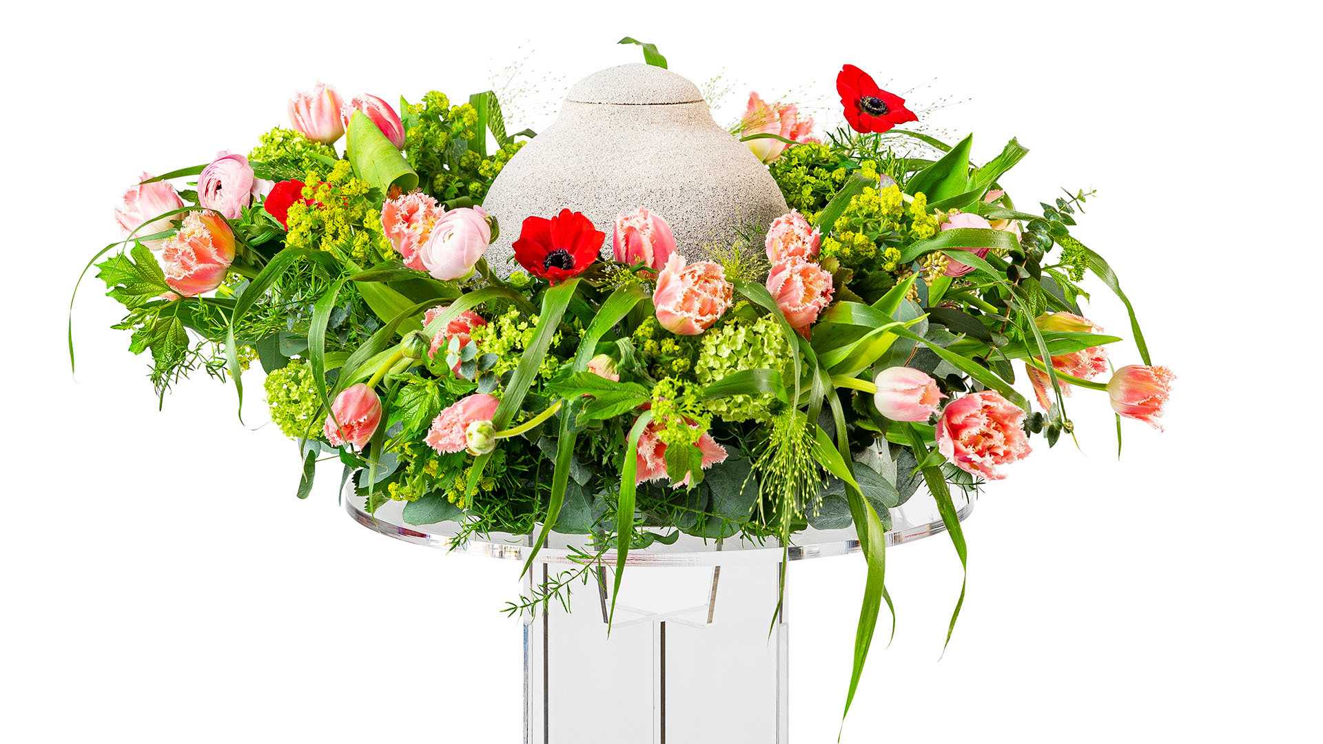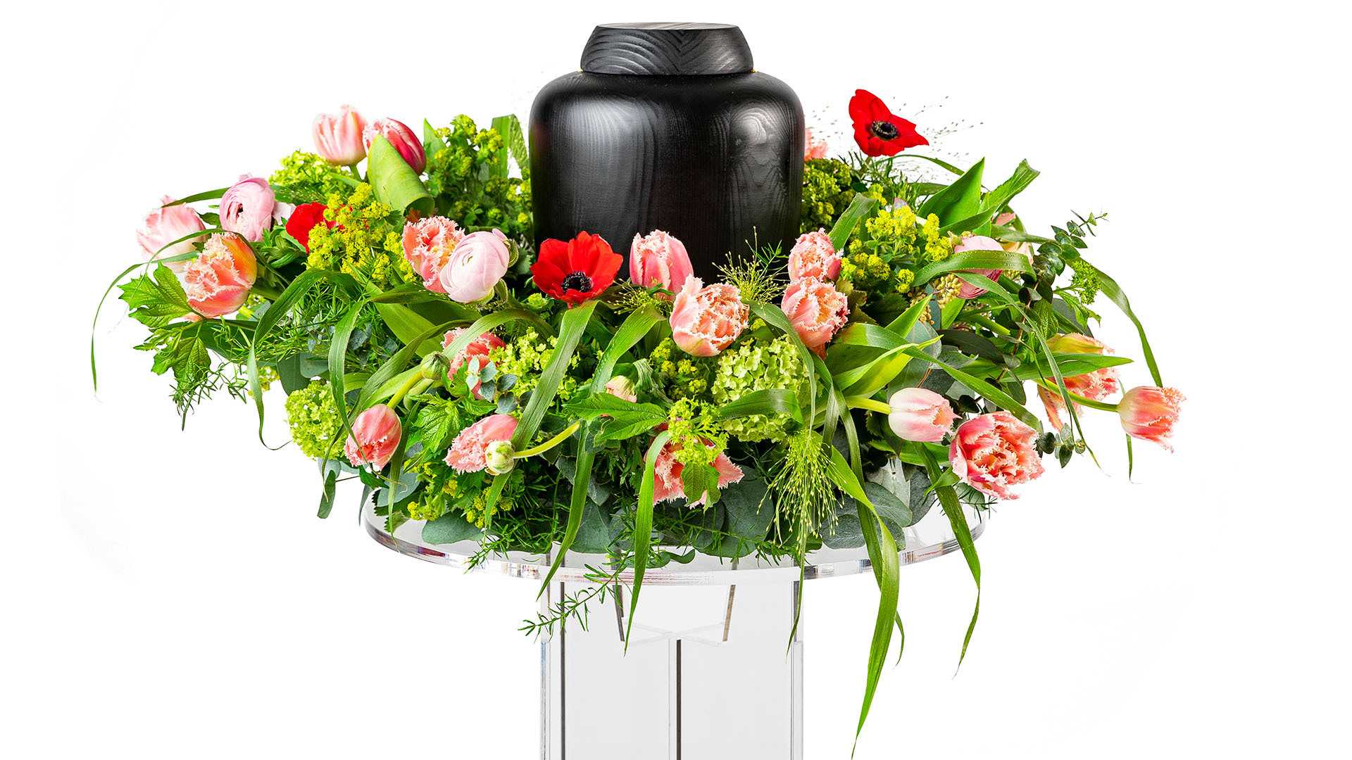 En omfamnande och stor urnkrans med en bas av krispiga tulpaner och frodigt grönt.