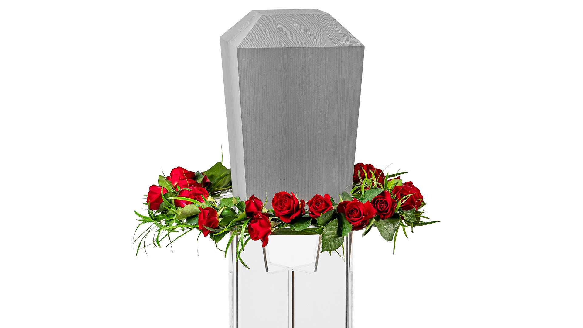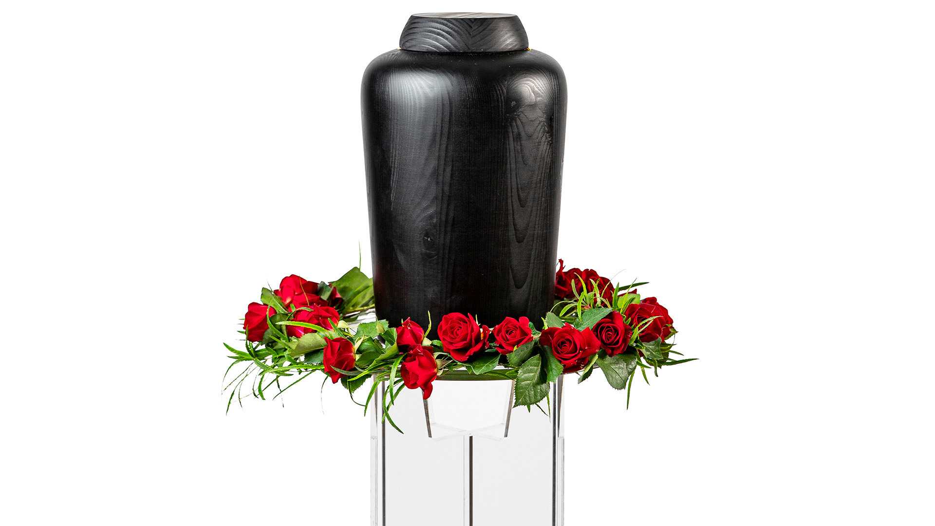 En urnkrans med små röda rosenknoppar och frisk grönska. Denna krans är bunden enbart på sina egna stjälkar.