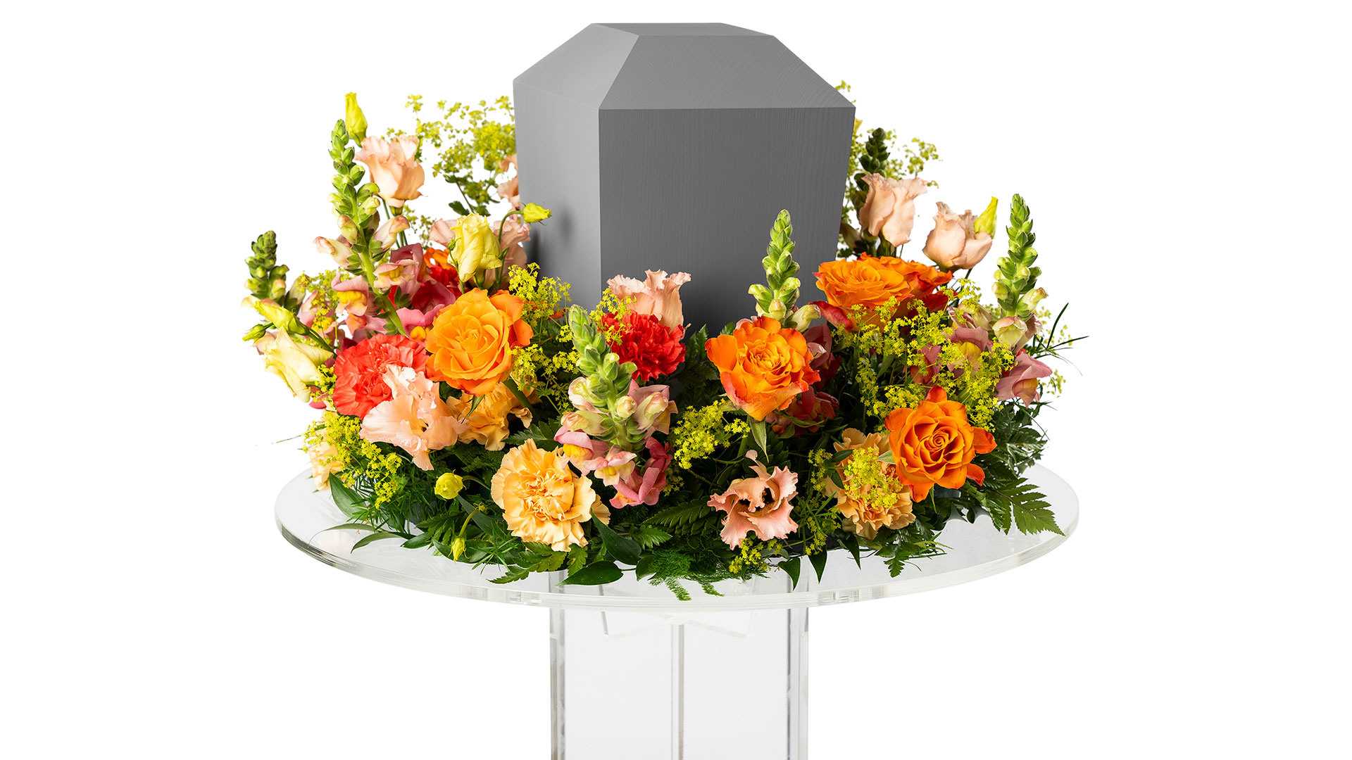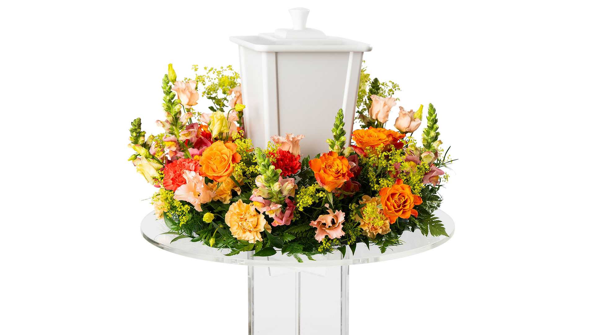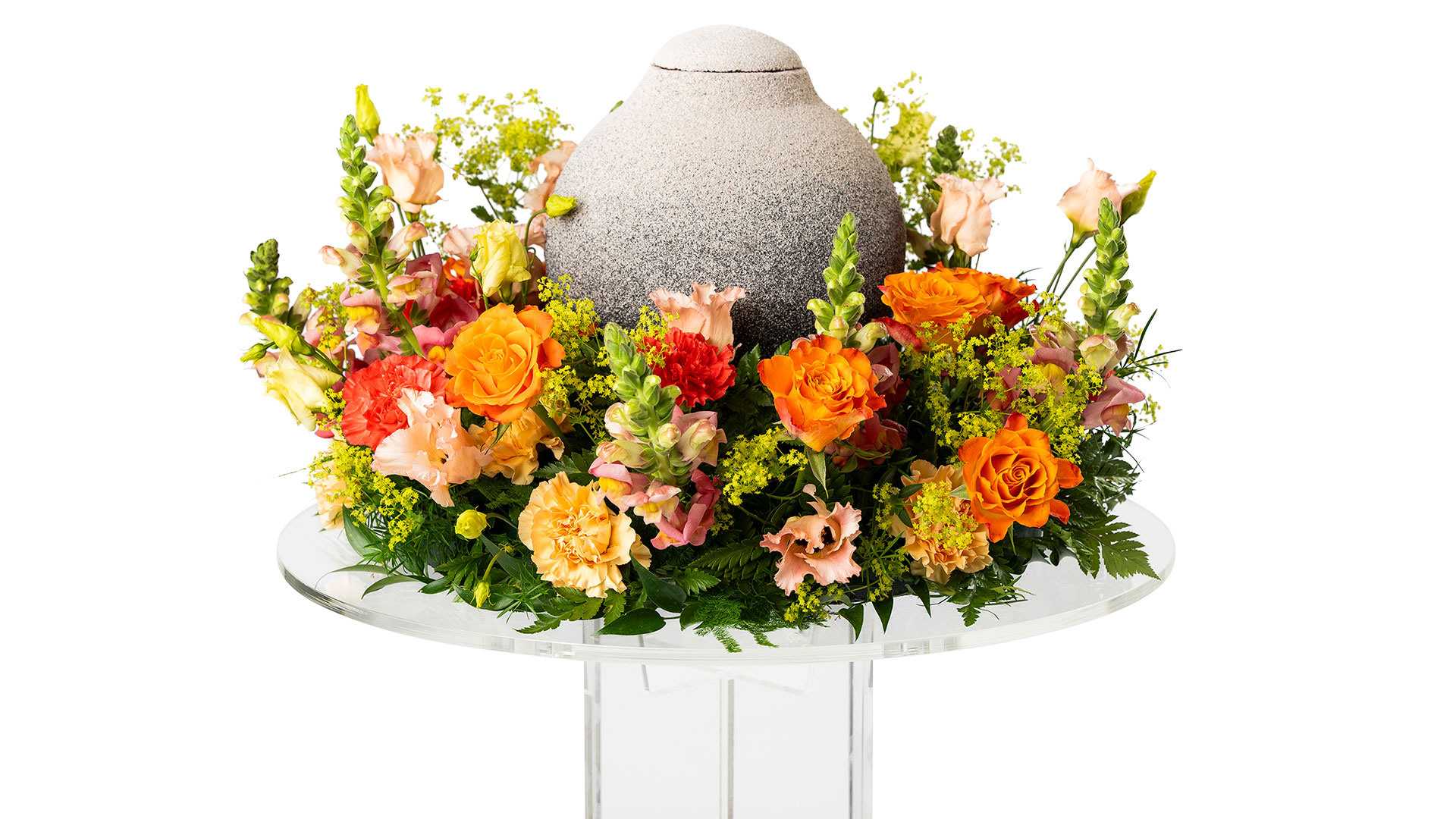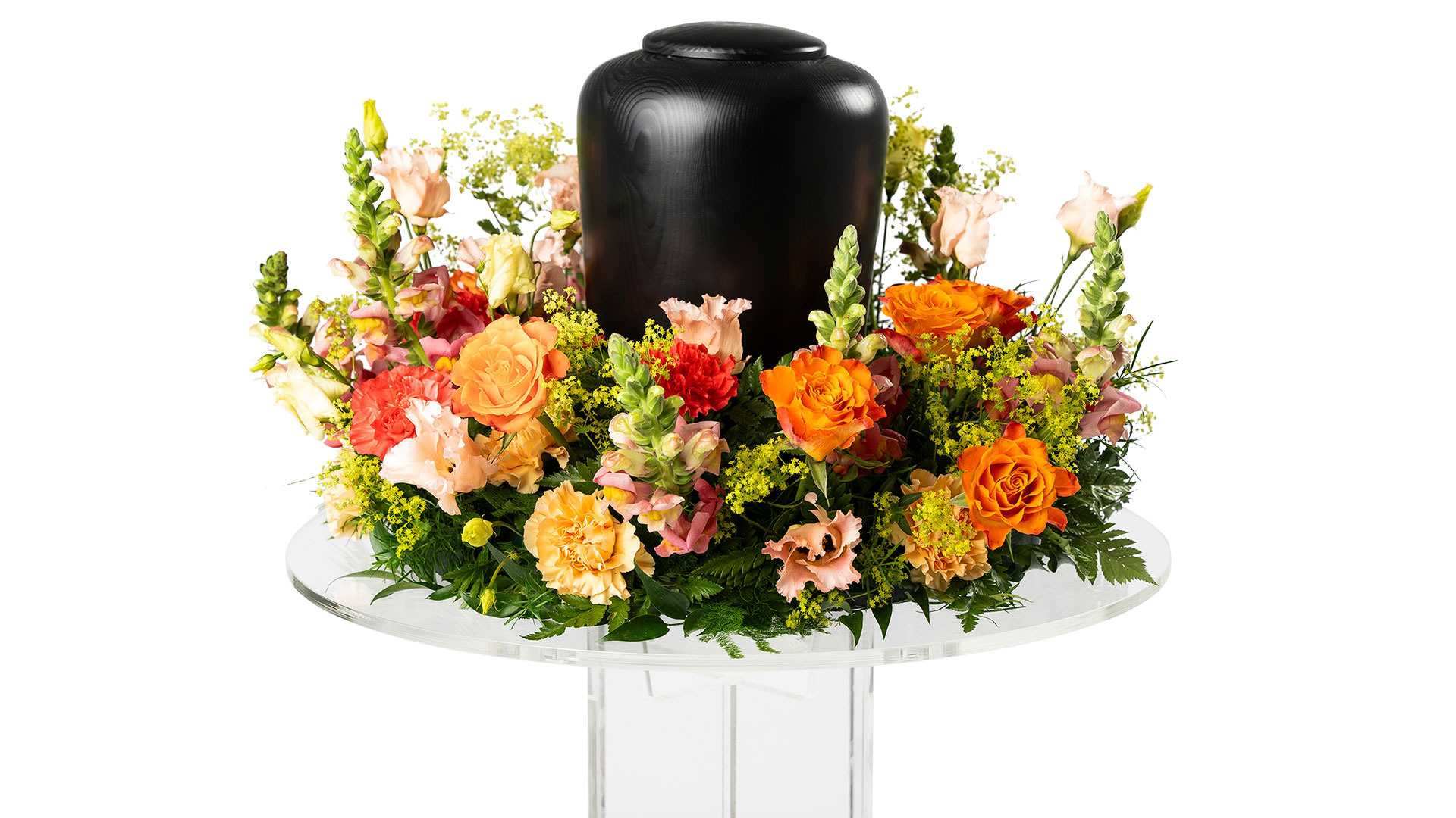En fyllig urnkrans med blommor i toner av aprikos och orange tillsammans med vacker grönska.