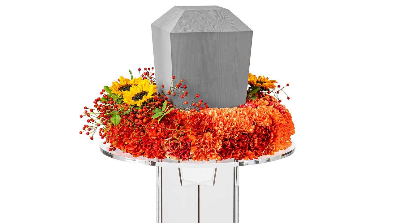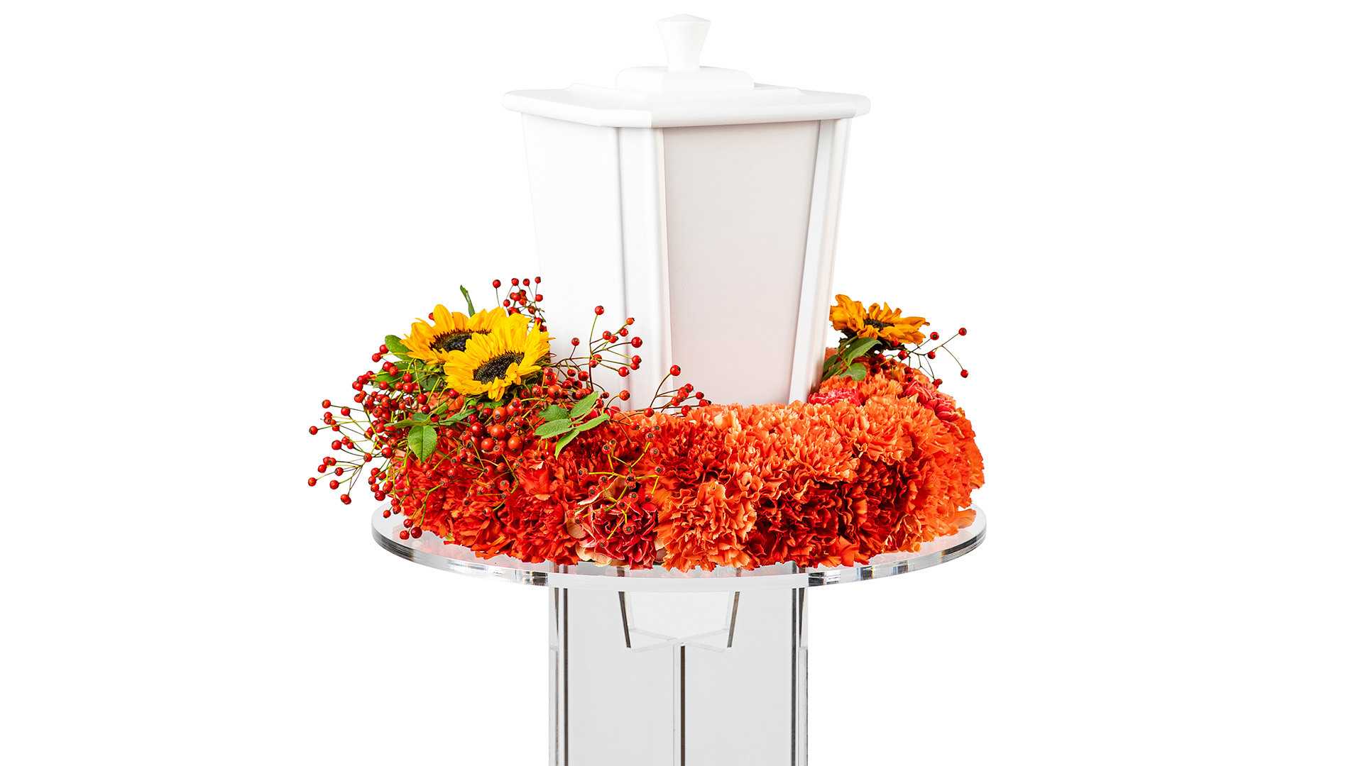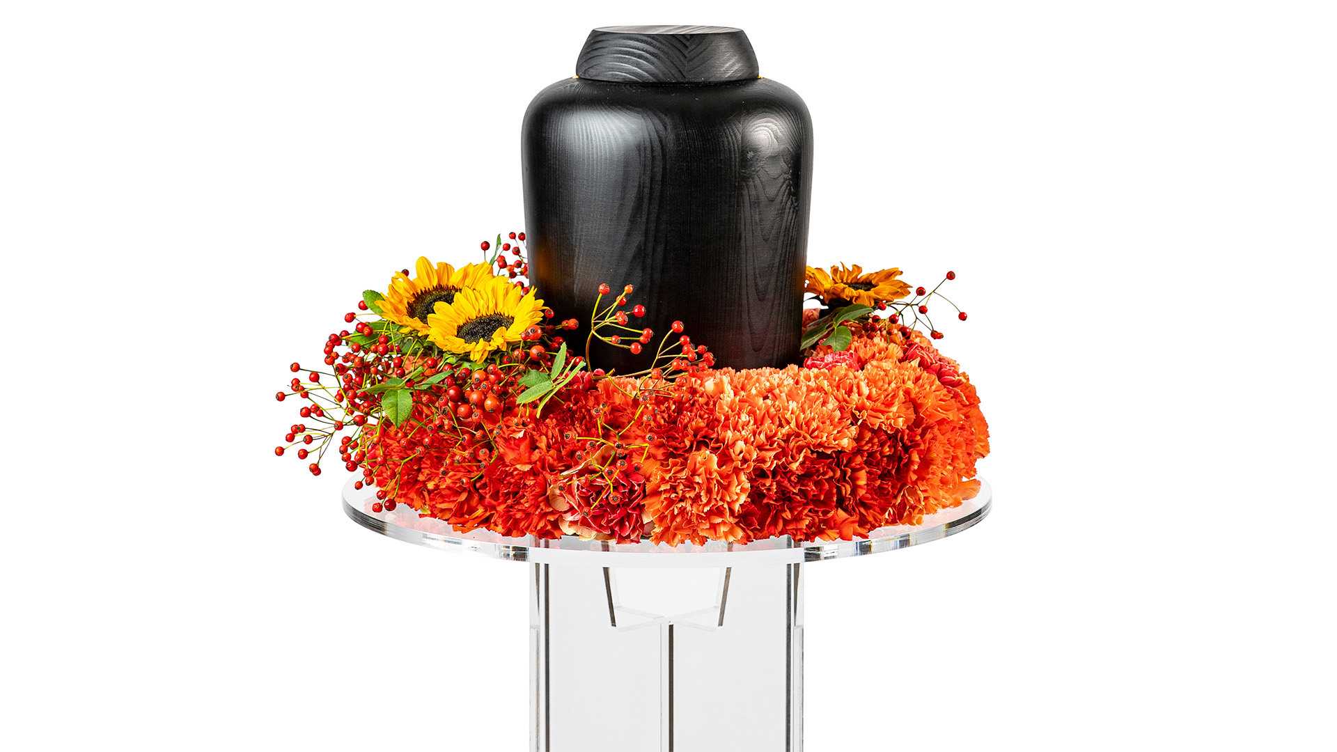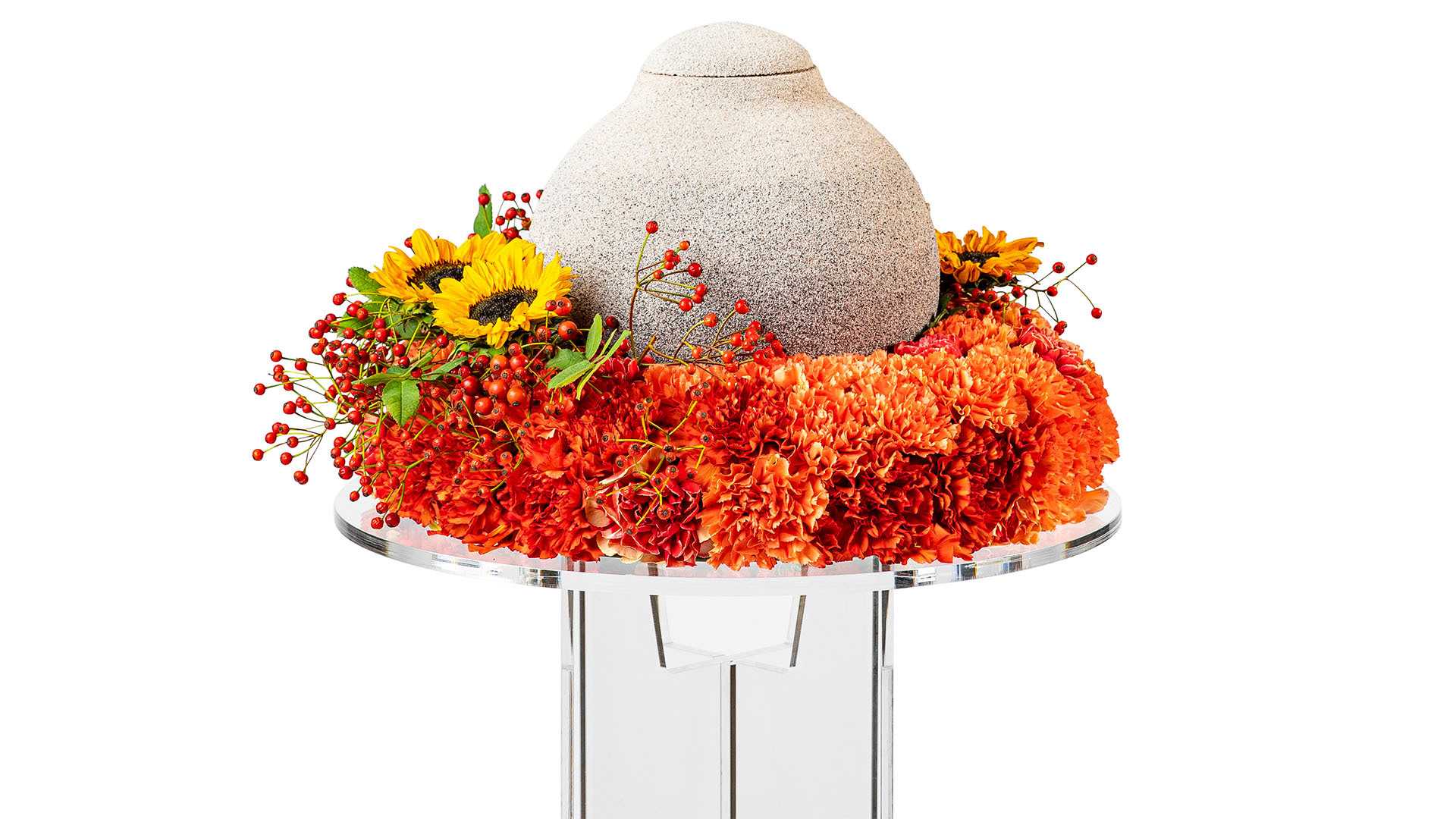 En tät urnkrans med nejlikor i toner av orange, dekorerad med röda bär och gula solrosor.