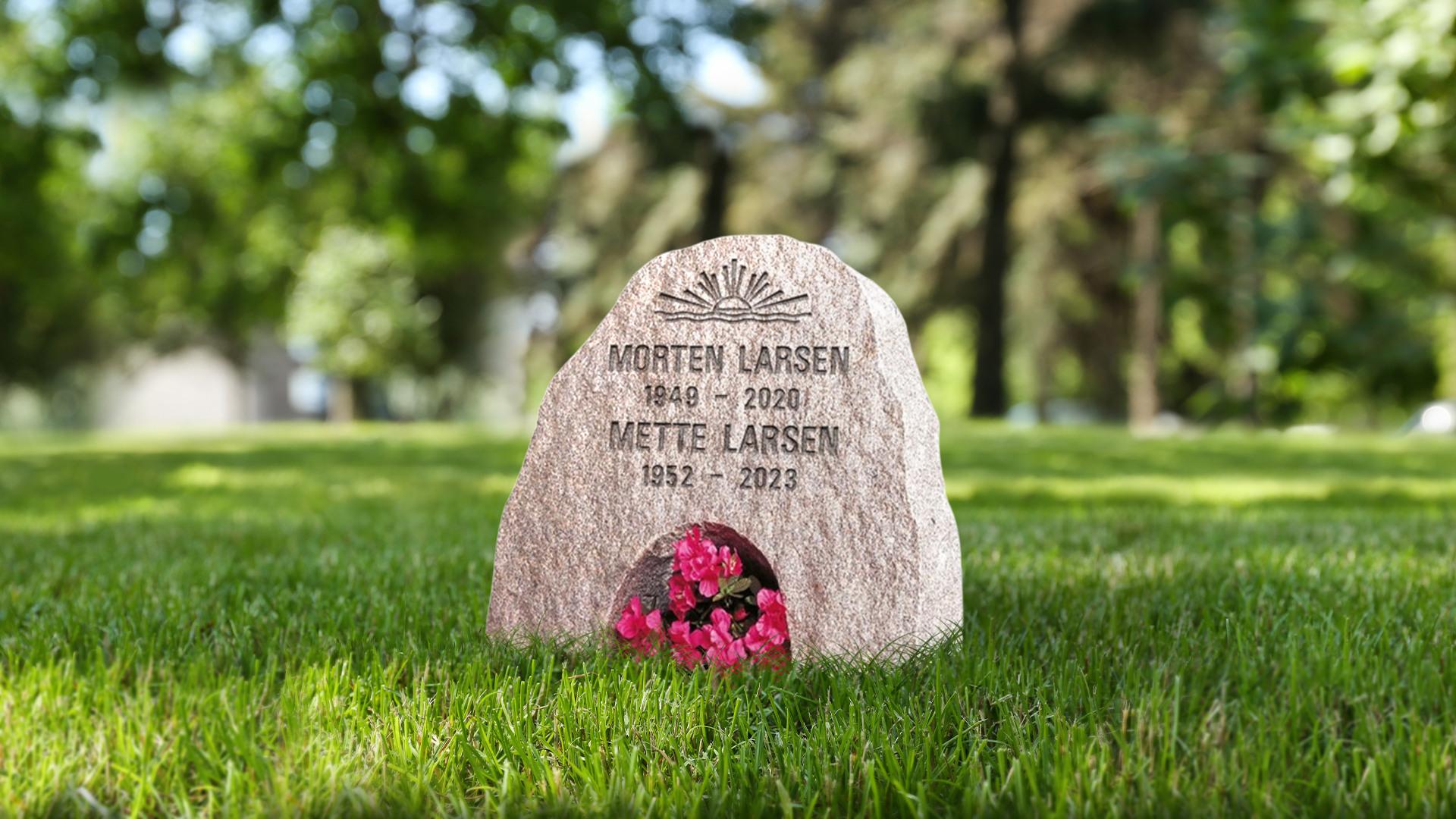 Stående sten med råarbetad rundad form och valv.- Modell: Bred stående