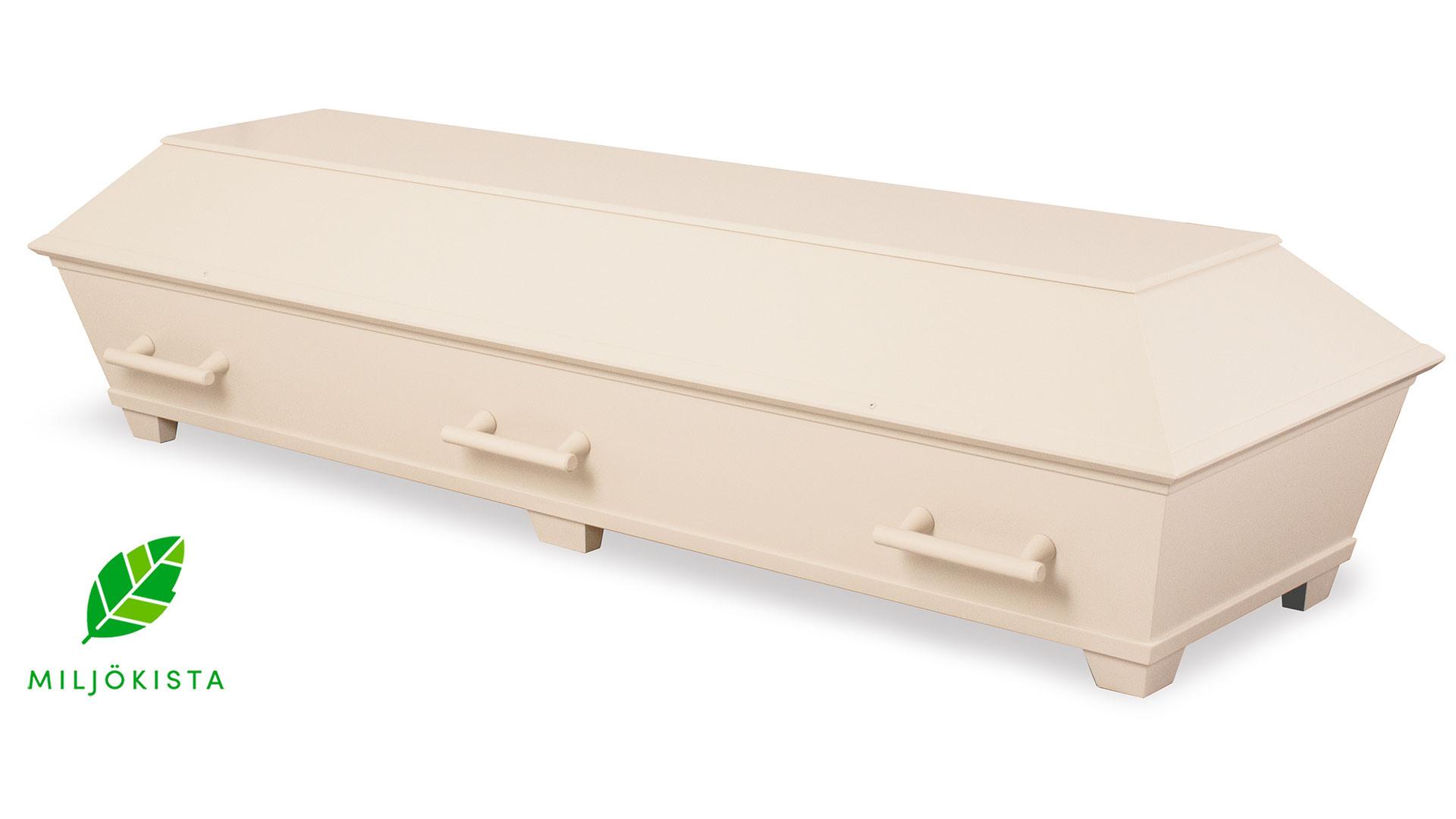 Tidlös är en stilren miljökista tillverkad av möbelskiva. Denna variant är målad i en ljust sandfärgad kulör. Inredningen består av en vadderad bädd, klädda sidor, kudde och mjukt, vadderat täcke med lakansflik. Textilierna är av 100% återvunnen polyester. Lockets insida är oinrett. Kistan finns även i större storlekar (mot pristillägg).