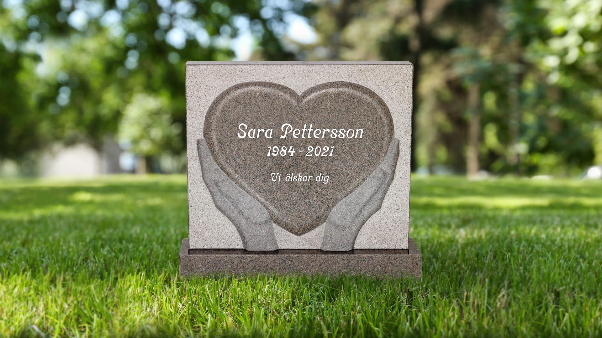 Stående sten med rektangulär yttre form och motivet av ett skulpterat hjärta i händer.