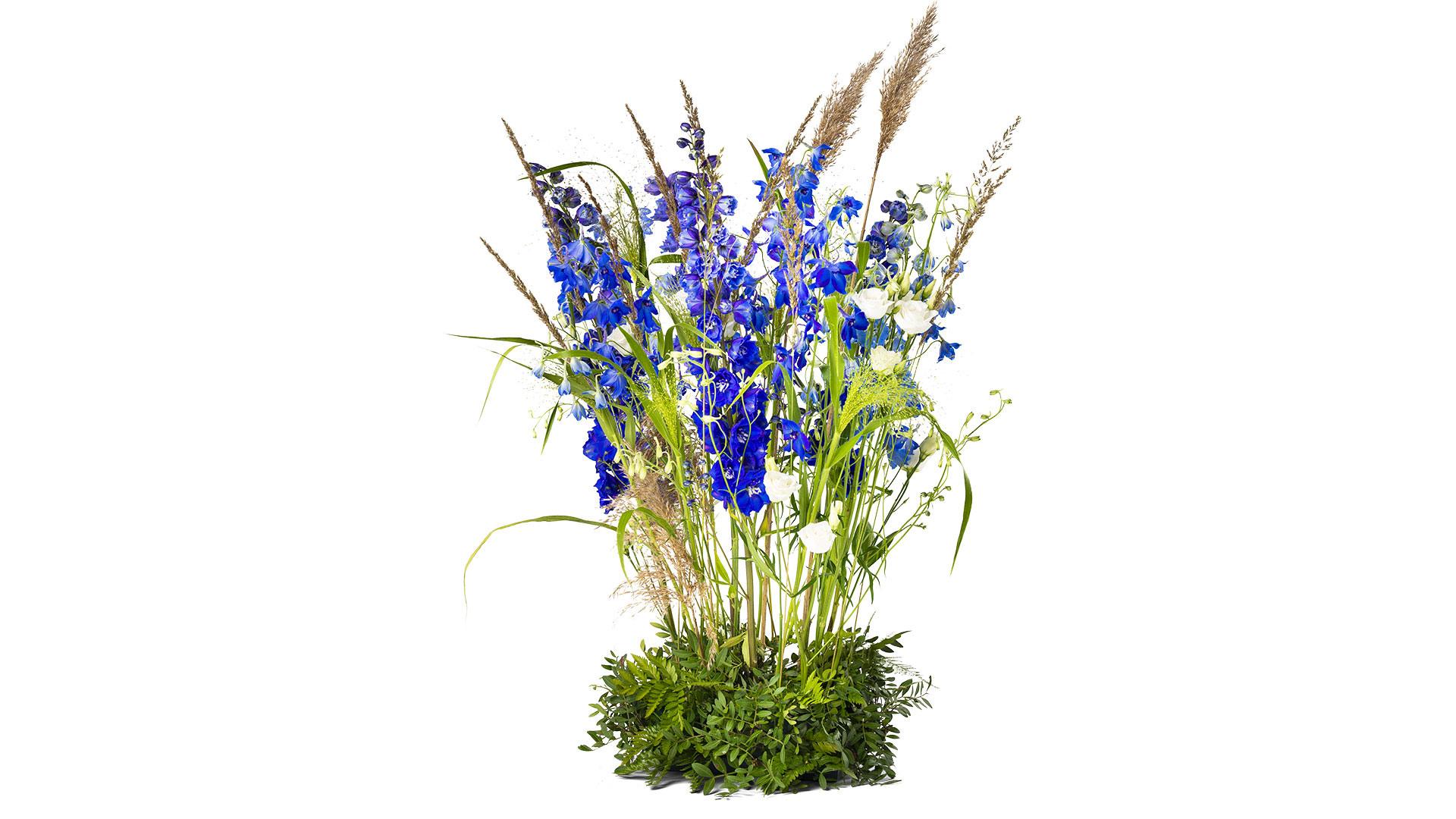 En växande blomsterdekoration i blått och grönt inspirerad av hav och strand.