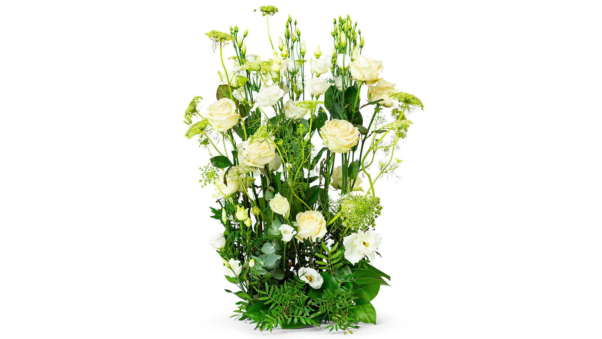 En växande mindre blomsterdekoration av en skir tuva med prärieklockor och cremevita rosor.
