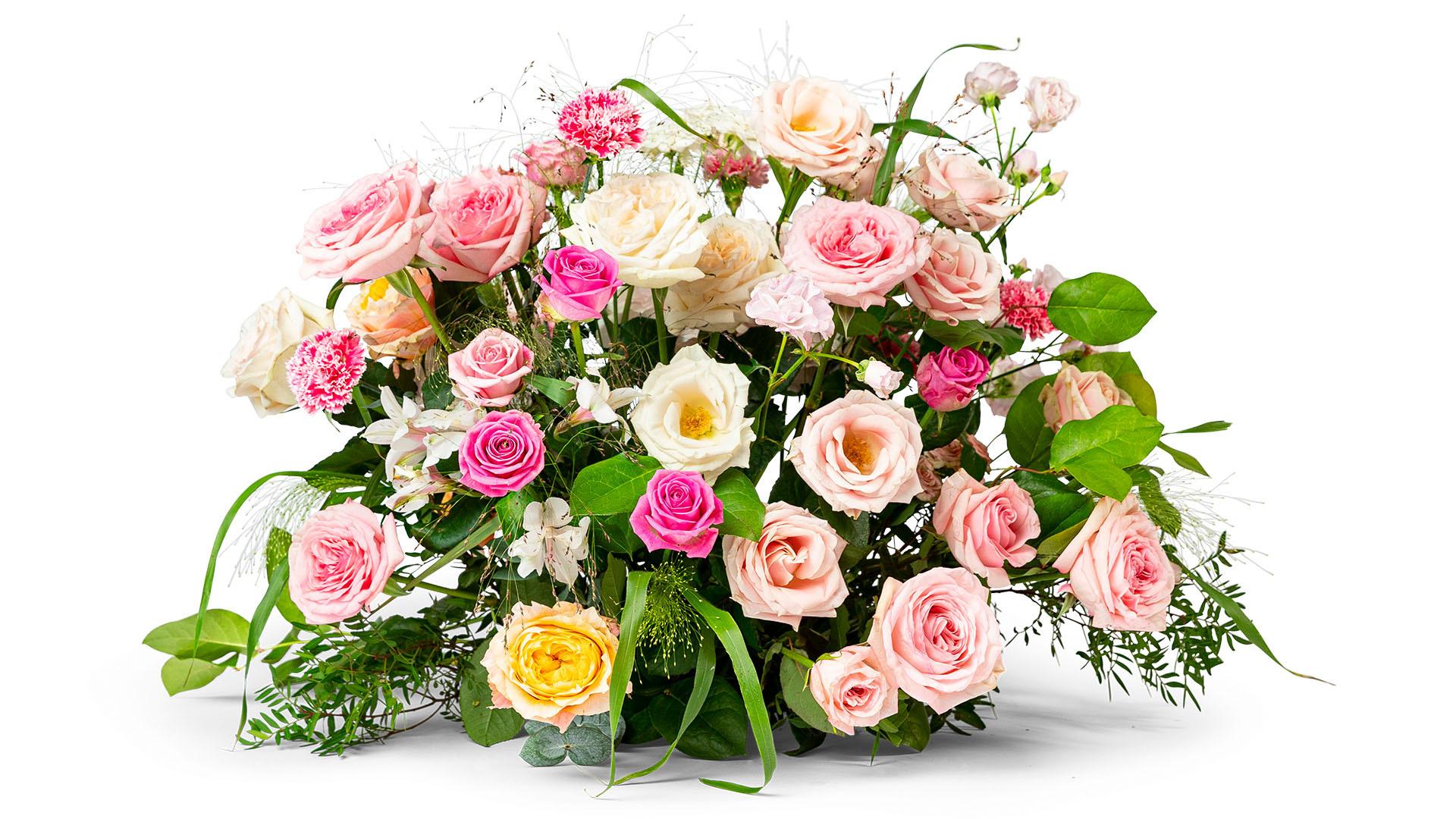 En stor blomsterdekoration av rosa rosor, fylld med allt från rosenknoppar till fullt utslagna rosor.