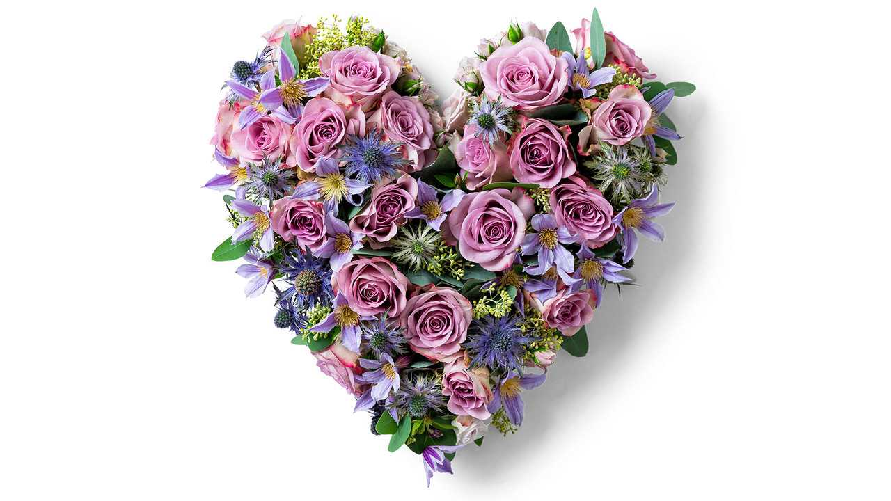 Ett fyllt hjärta med rosor och klematis i olika lila toner tillsammans med tistlar och gröna blad.