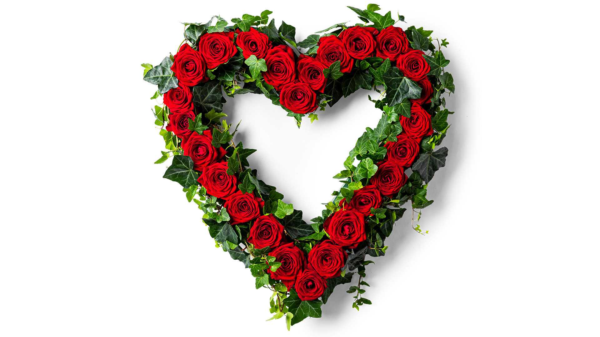 Ett öppet hjärta med vackra djupröda rosor och slingrande murgröna.