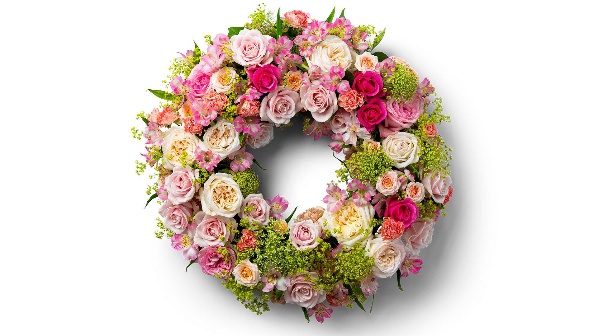 En blomstrande krans med bland annat rosor i olika pastelltoner och skir grönska.