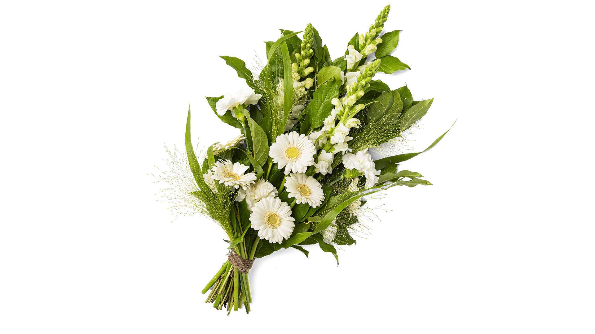 En stilren liggande bukett med vita blommor och vackert grönt.