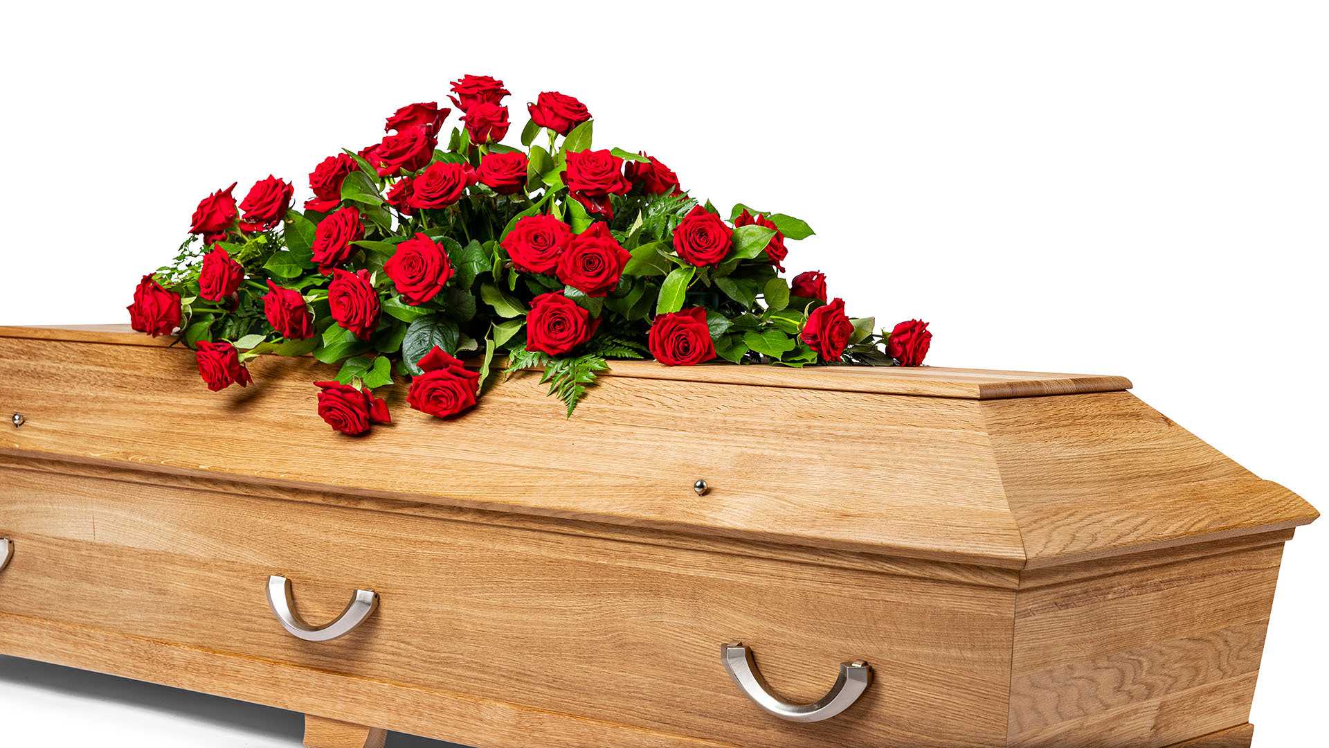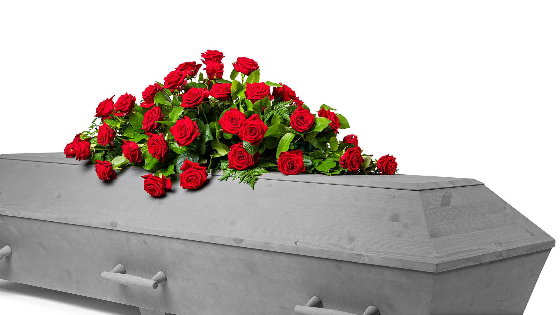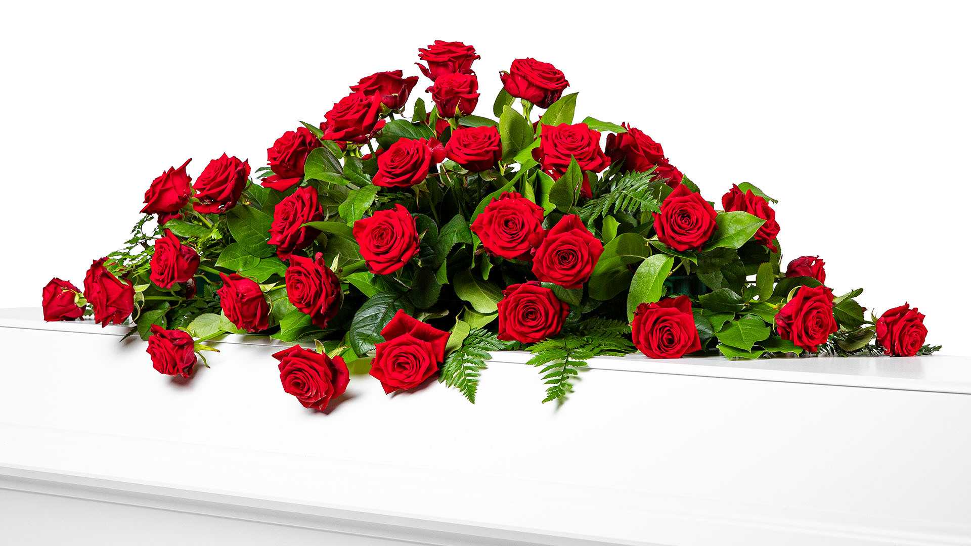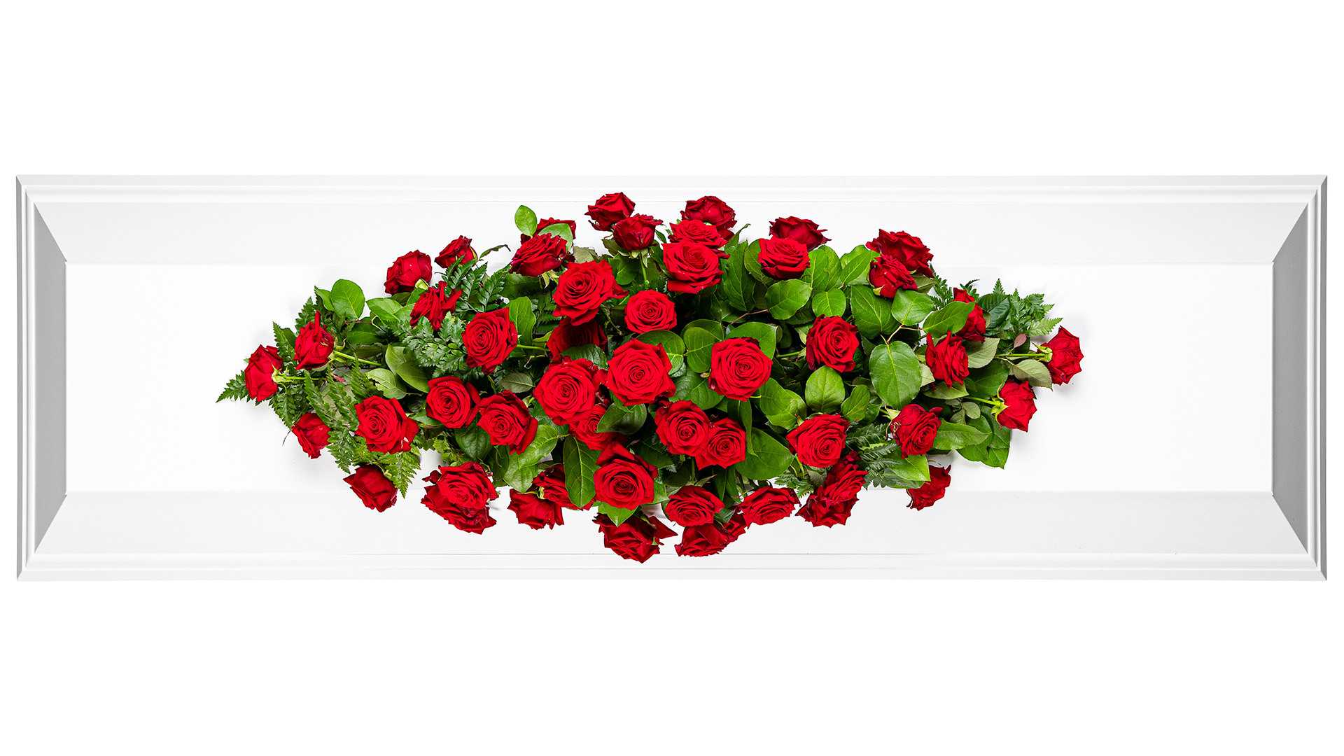 En klassisk mindre kistdekoration med vackra djupröda rosor och frodigt grönt.