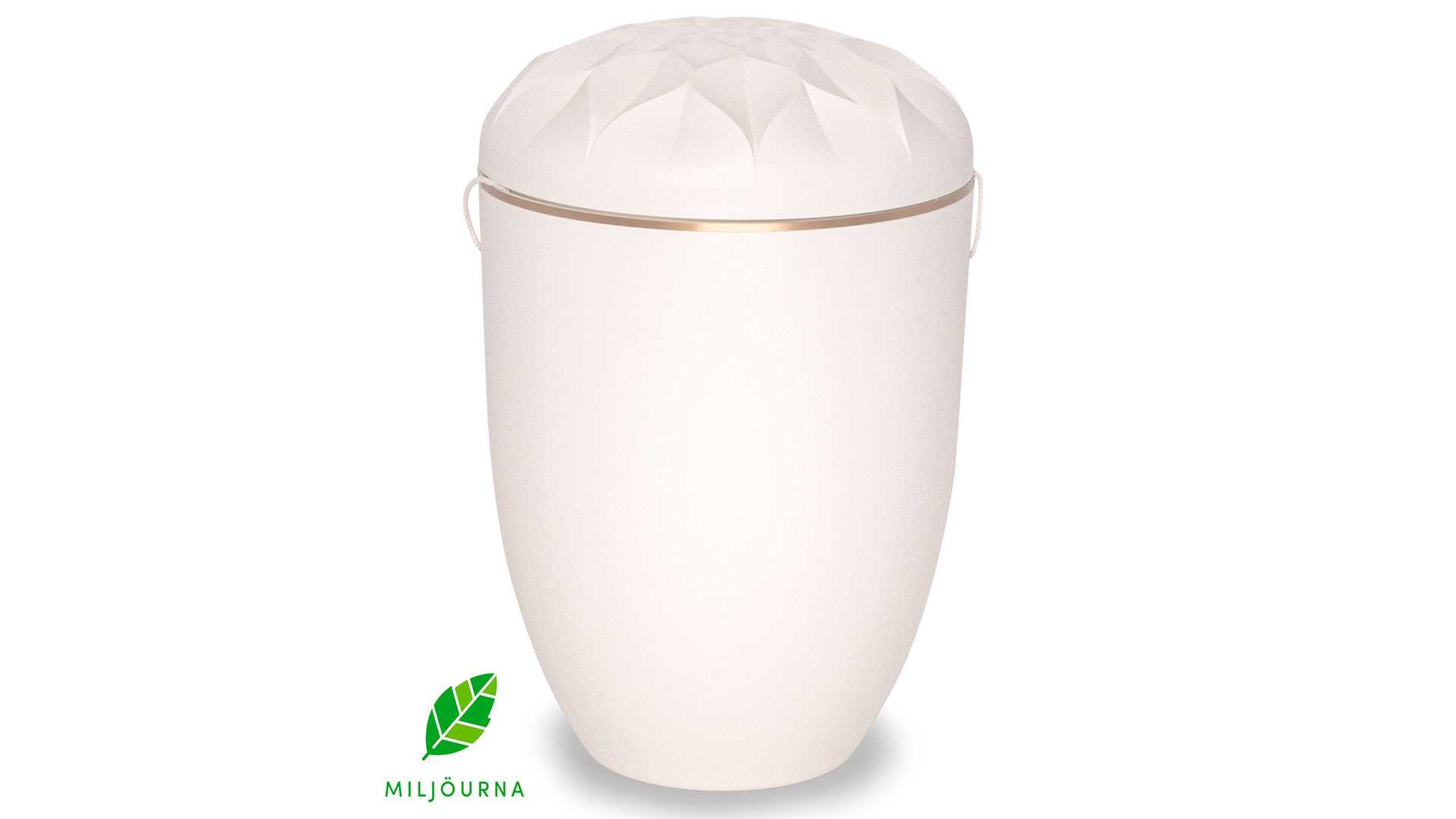 Galant är en designurna tillverkad av biofiber och är 100 % nedbrytbar. Denna variant är målad i vitt med vackra detaljer på locket. Urnan är förgänglig och har en stor öppning upptill vilket gör den lämplig för såväl gravsättning som för minneslund/askgravlund, där endast askpåse får användas. Levereras med sänkband.