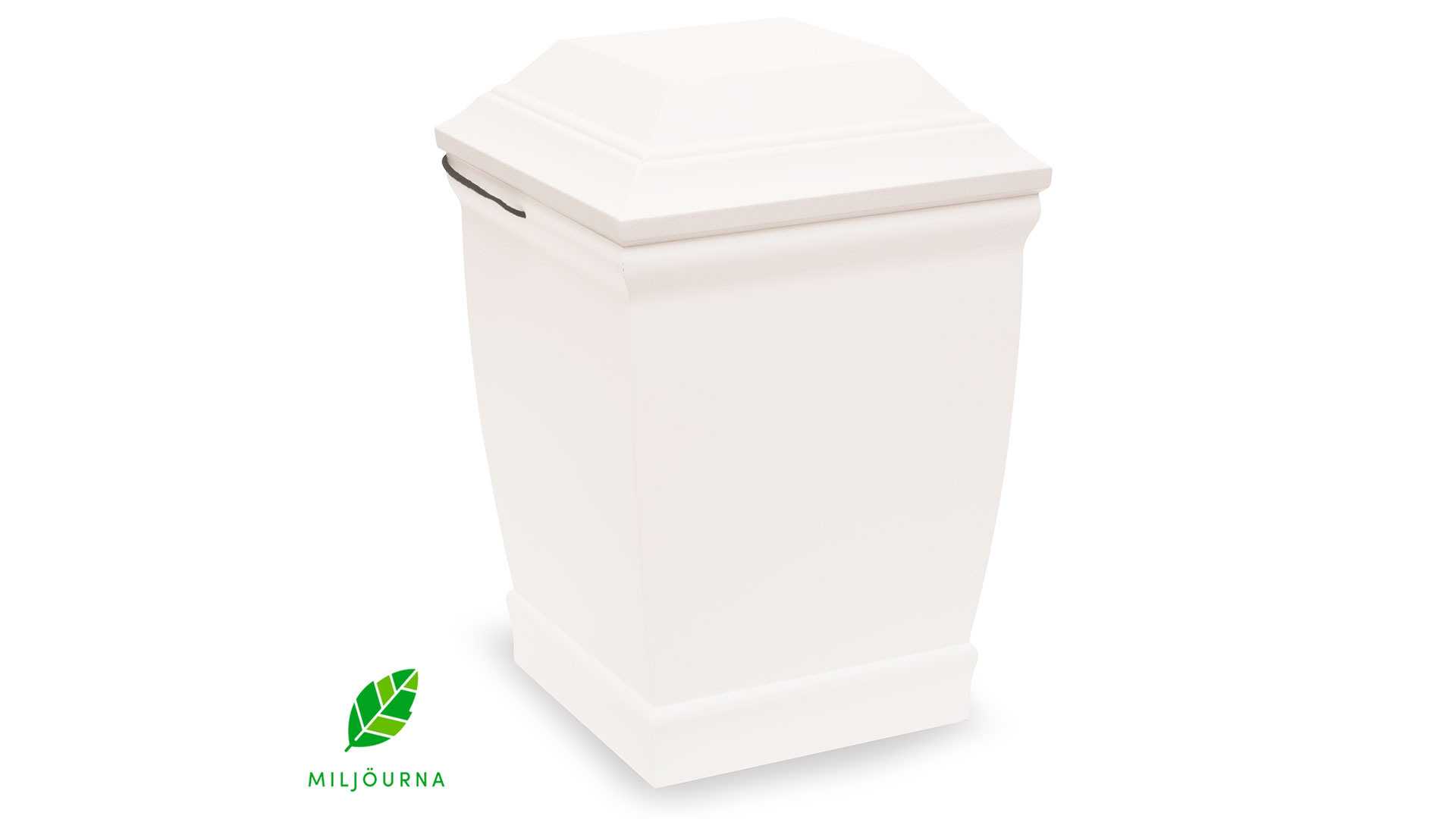 Klassisk är en urna tillverkad av massiv furu och är 100% nedbrytbar. Denna variant är målad i vitt. Urnan är förgänglig och lämplig för gravsättning. Levereras med sänkband.