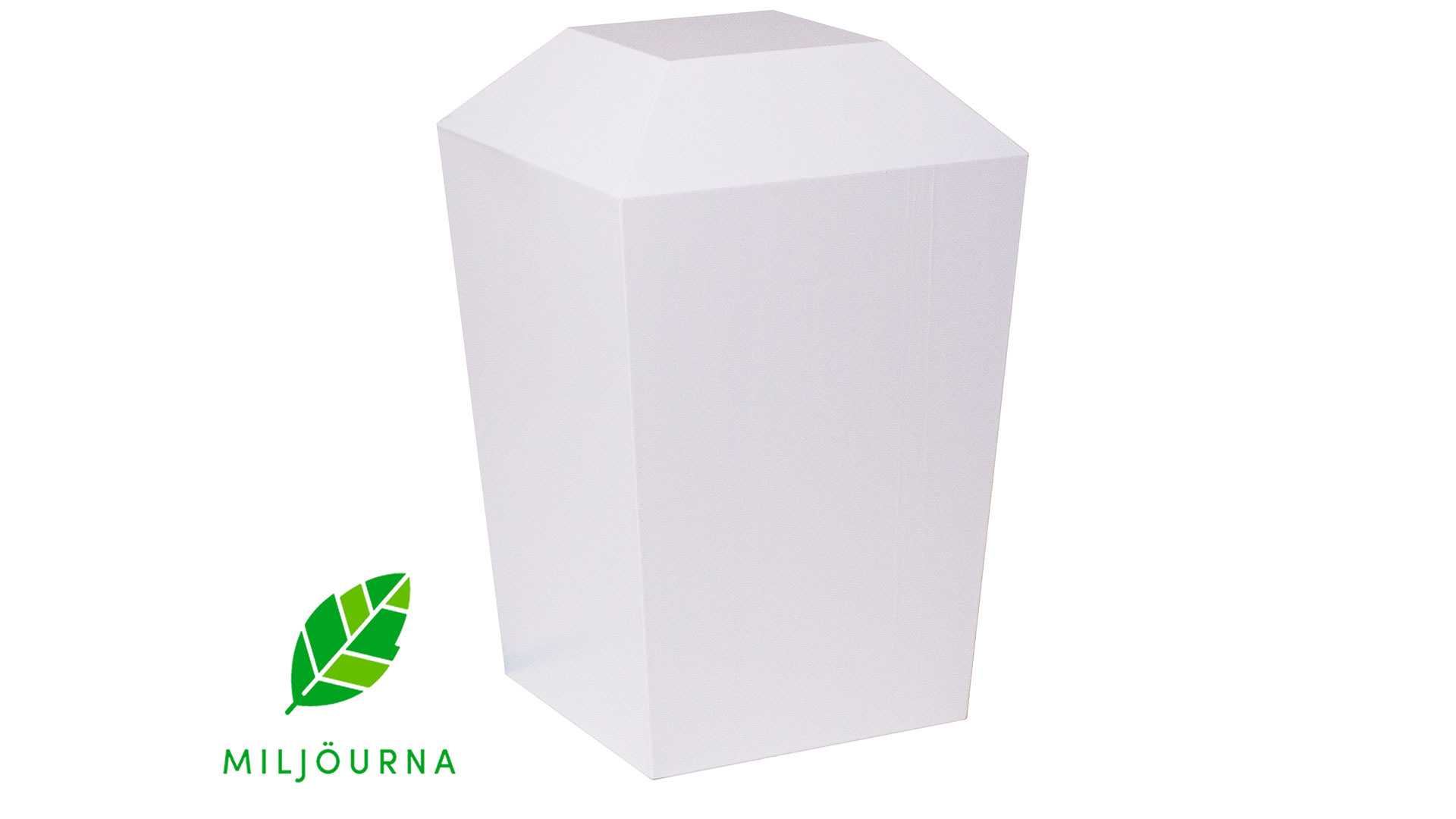 Modern är en stilren urna tillverkad av massiv furu och är 100% nedbrytbar. Denna variant är målad i vitt. Urnan är förgänglig och lämplig för gravsättning. Levereras med sänkband.
