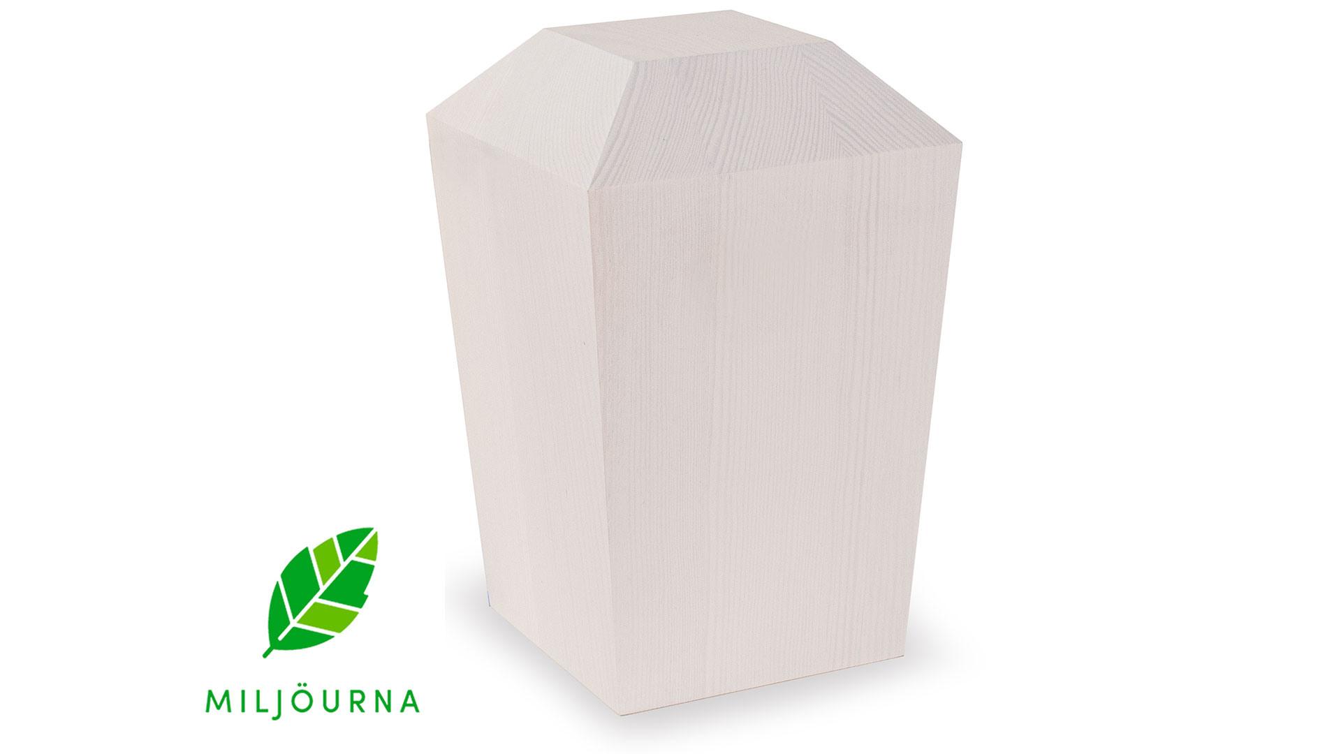 Modern är en stilren urna tillverkad av massiv furu och är 100% nedbrytbar. Denna variant är vitpigmenterad och träets naturliga struktur är synlig. Urnan är förgänglig och lämplig för gravsättning. Levereras med sänkband.