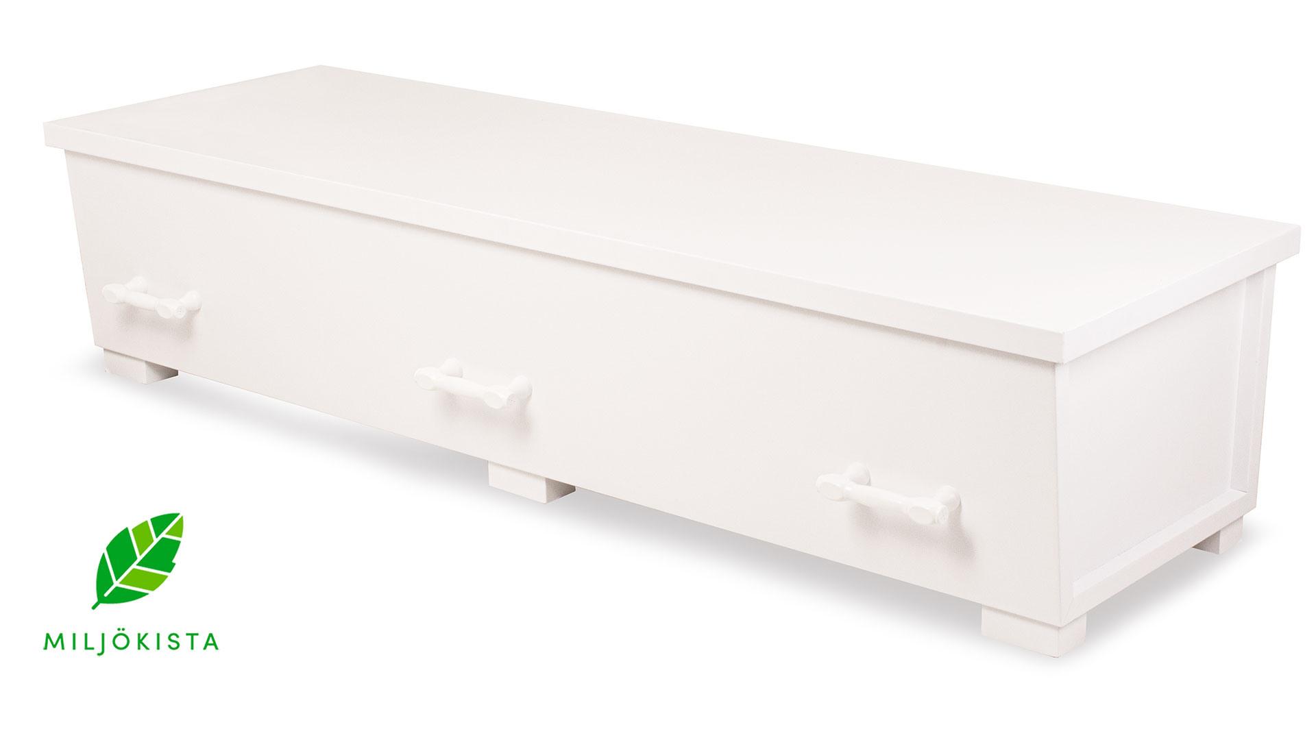 Orbit är en minimalistisk urna tillverkad av ett lättviktsmatrial av träfiber. Denna variant är färgad i vitt. Urnan är förgänglig och lämplig för gravsättning. Levereras med sänkband.