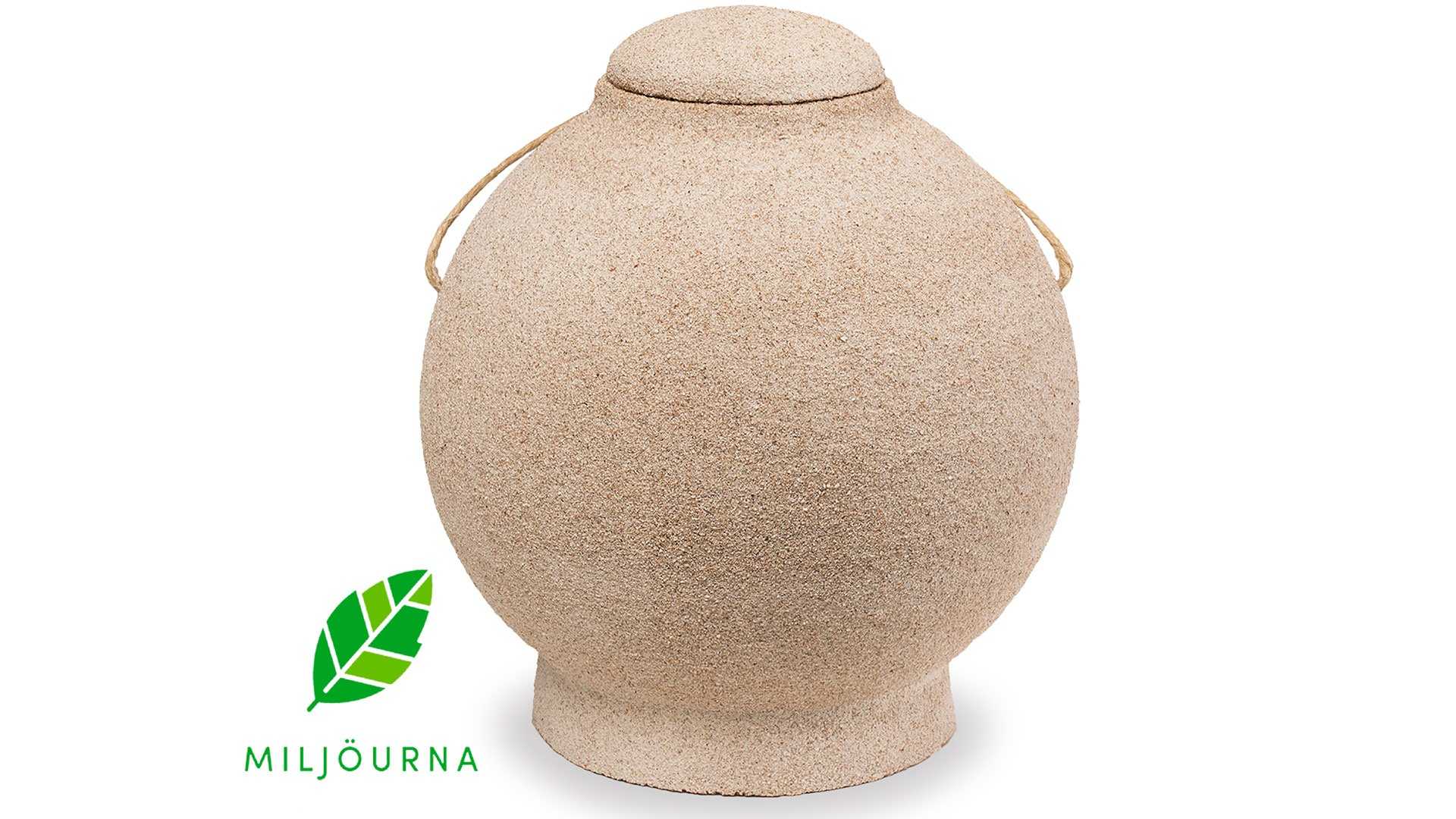 Urna av sand från vår svenska kust. Denna variant har en rund form och har en ljus naturlig färg av sand. Urnan är förgänglig och är speciellt framtagen för spridning i vatten men är även lämplig för gravsättning i jord. Levereras med sänkband.