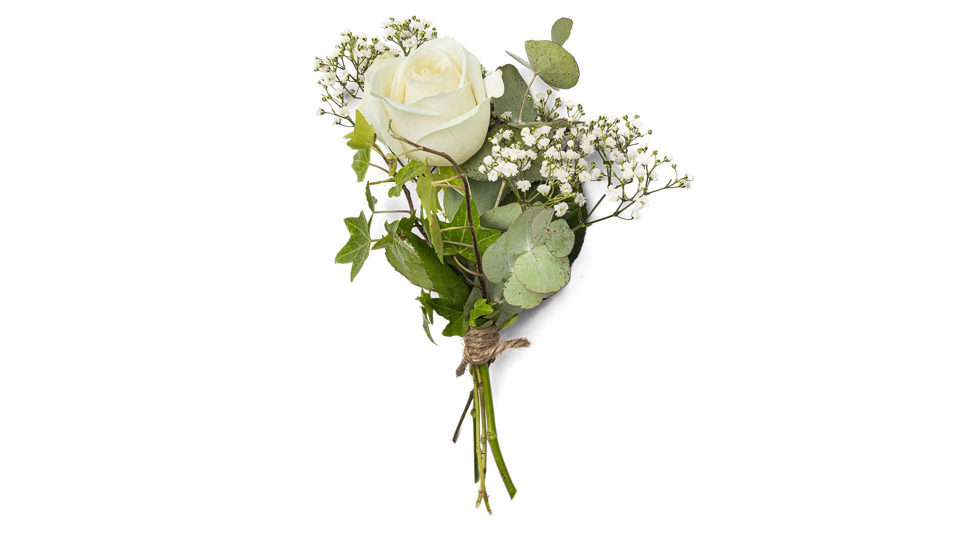 En urndekoration i form av en vacker berså med omfamnande känsla, bestående av bland annat cremevita rosor och silvergrå eukalyptus.